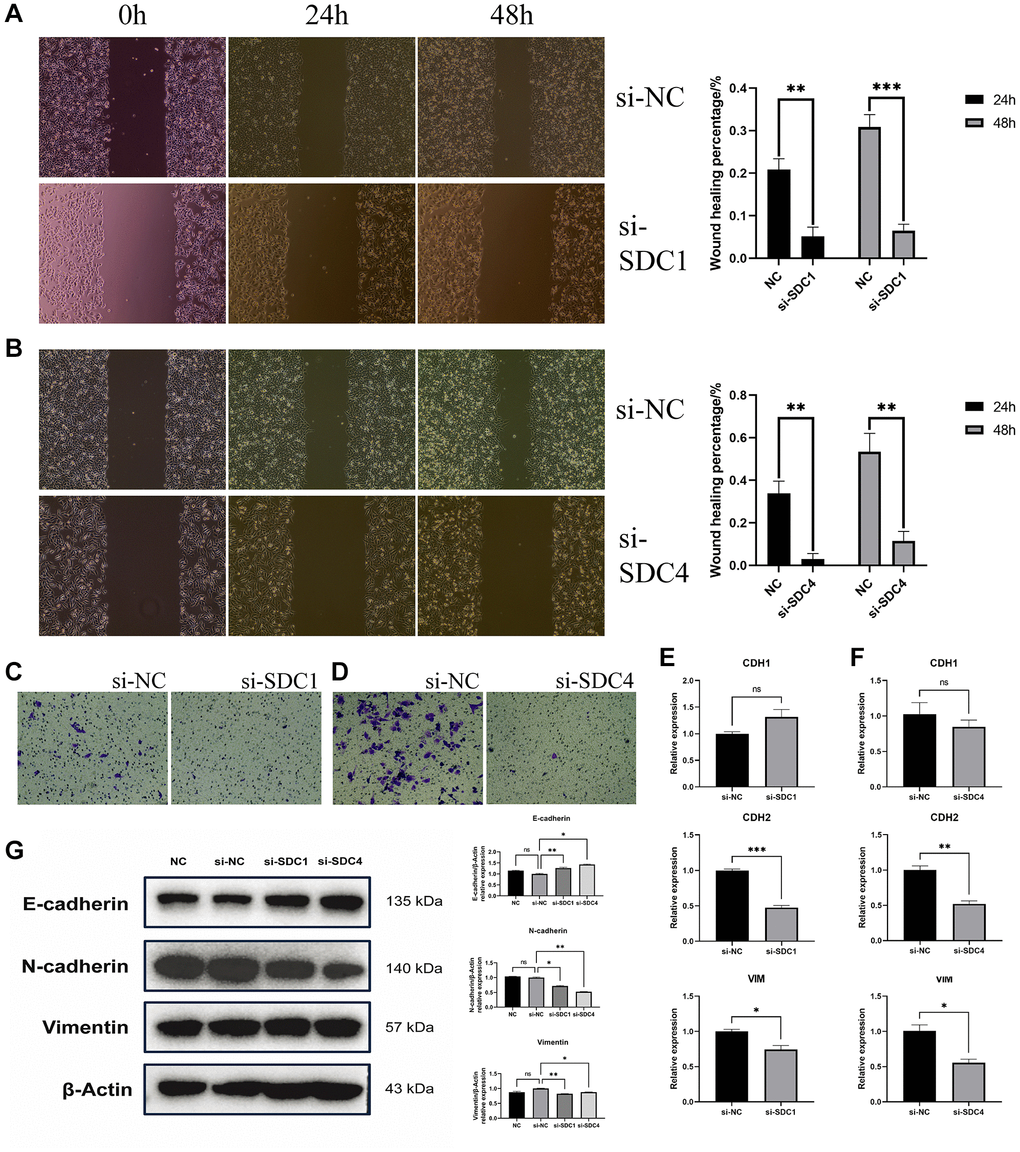 RT-qPCR results revealed that upon SDC1 knockdown, although CDH1 expression in the si-SDC1 group (Figure 7E) did not significantly differ from the si-NC group (P = 0.0952), the expression levels of CDH2 (P = 0.0001) and VIM (P = 0.0163) were significantly lower than those in the si-NC group. Similarly, CDH1 expression in the si-SDC4 group (Figure 7F) showed no significant difference from the si-NC group (P = 0.2632), but CDH2 (P = 0.0024) and VIM (P = 0.0104) expression levels were significantly lower.
