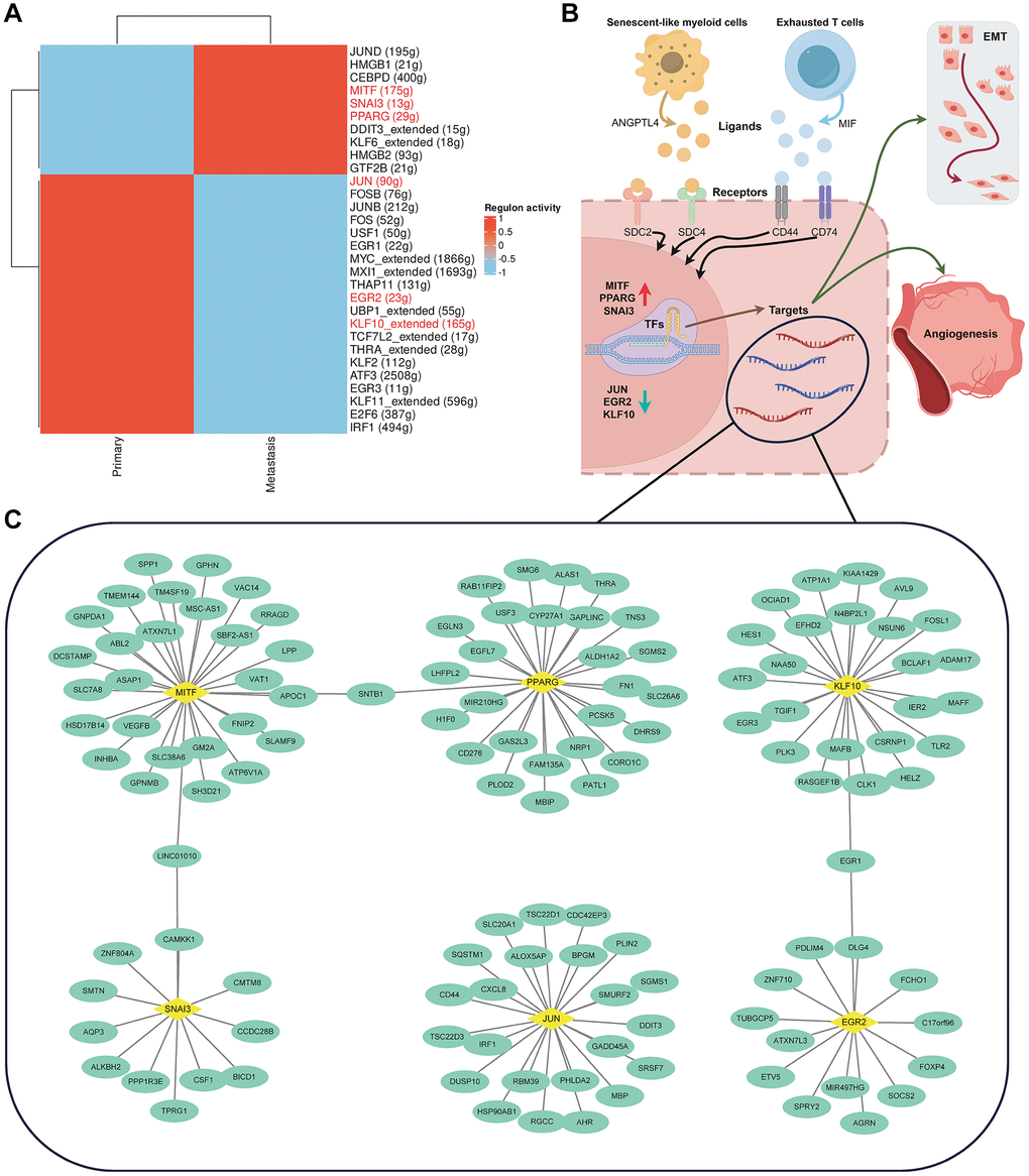 For malignant tumor cells, we reconstructed transcription factor-gene regulatory networks using the SCENIC algorithm. By conducting an EMTome analysis of transcription factors, we identified those associated with EMT. The results indicated that, compared to pCRC, transcription factors MITF, SNAI3, and PPARG in LM exhibited specific high activity, whereas transcription factors JUN, ERG2, and KLF10 displayed low activity (Figure 8A). Additionally, HMGB1, HMGB2, and CEBPD exhibited elevated activity. Based on enrichment analysis, cell communication, and transcription factor regulation analysis, we hypothesize that senescent and exhausted immune cells promote EMT and angiogenesis in CRC, thereby contributing to the molecular mechanisms underlying tumor progression and metastasis (Figure 8B). The EMT-related Regulons network is illustrated in Figure 8C.