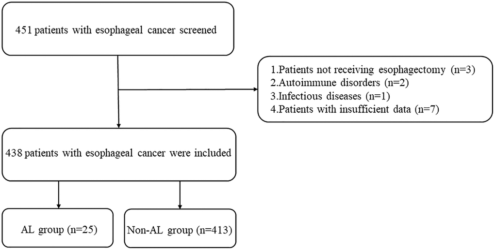 For this particular investigation, a total of 438 patients diagnosed with EC were enrolled, and they were admitted to the Affiliated Huaian No. 1 People’s Hospital of Nanjing Medical University during the period spanning September 2020 to March 2022. Inclusion criteria encompassed an age exceeding 18 years, confirmed diagnosis of EC supported by pathological evidence, and having undergone esophagectomy. Exclusion criteria entailed the presence of concurrent malignancies, infectious diseases, autoimmune disorders, or inadequate availability of data. The diagnosis of AL was established through the utilization of various criteria, including the identification of contrast extravasation on postoperative computed tomography, leakage of gastrointestinal tract contents via a wound or drainage tube, appearance of blue liquid in the incision or pleural drainage following oral administration of methylene blue, and endoscopic observations indicative of AL. The diagnosis of AL among EC patients occurred within the time frame ranging from the 3rd to the 10th day postoperatively. The severity of AL was classified into three grades: grade A, necessitating no active therapeutic intervention; grade B, requiring active therapeutic interventions excluding surgery; and grade C, necessitating surgical intervention. Informed consent was obtained from all participants, and the study protocol obtained approval from the Ethics Committee of Huaian No. 1 People’s Hospital, adhering to the principles outlined in the Helsinki Declaration.