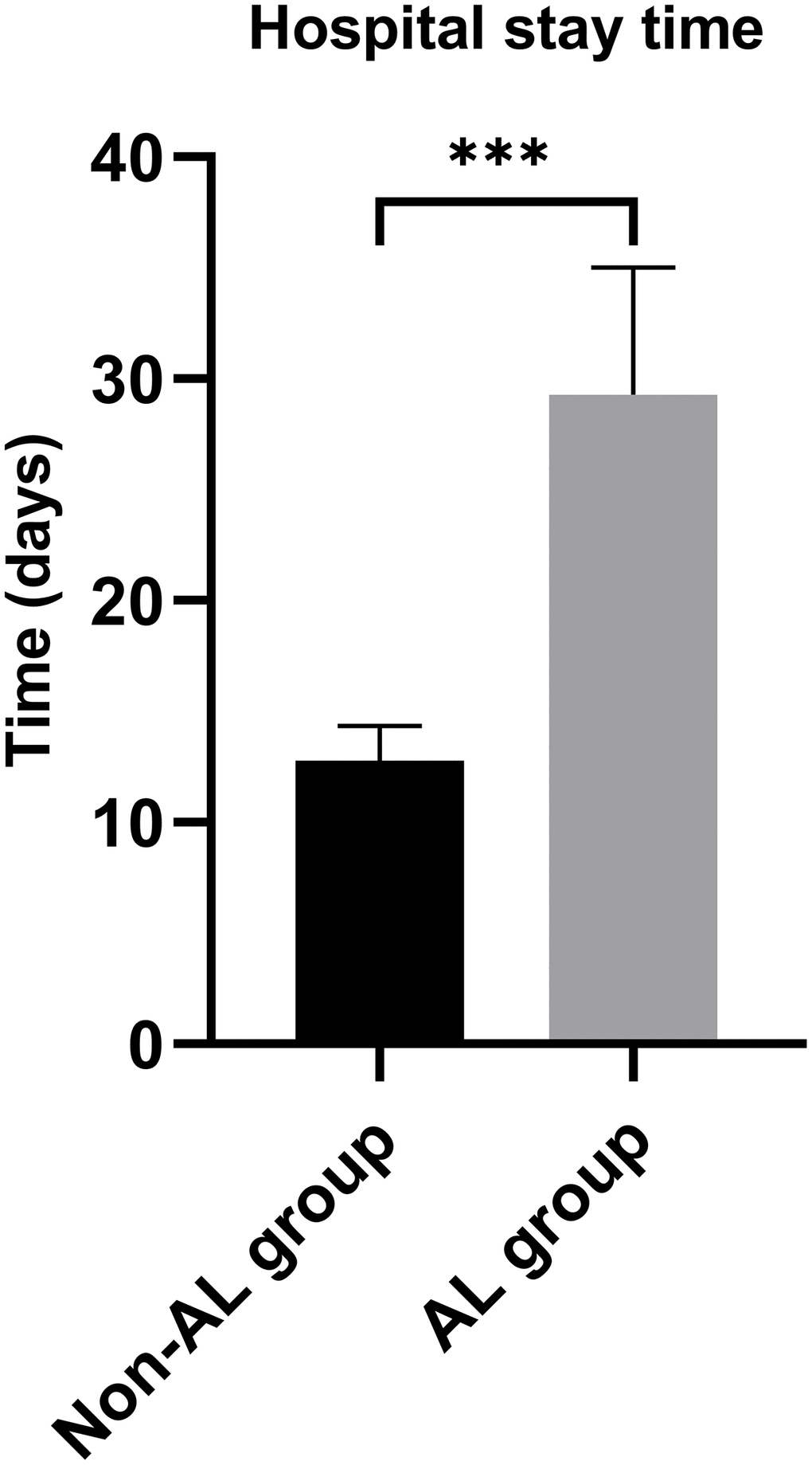 The study enrolled a total of 438 patients diagnosed with EC, as illustrated in Figure 1. Among them, 25 patients experienced AL. The clinicopathological characteristics of the EC patients are presented in Table 1. Notably, the AL group displayed a considerably prolonged hospitalization duration in comparison to the non-AL group, as depicted in Figure 2 (29.28 ± 5.73 days vs. 12.78 ± 1.58 days, p < 0.001). Age (62.00 ± 9.77 years vs. 57.56 ± 9.84 years), smoking status, and the presence of fasting blood glucose (FBG) exhibited significant disparities between the two groups (Table 2). No other variables demonstrated significant differences between the AL and non-AL groups. The severity of AL was categorized into grades A, B, and C, encompassing 3, 21, and 1 patient(s) in each respective category (Supplementary Table 1); the variations in the levels of CRP, PCT, IL-6, and IL-10 among these three groups are shown in Supplementary Table 2.