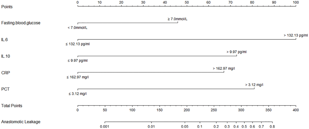 This study revealed that the levels of IL-10, IL-6, CRP, and PCT in the peripheral blood were significantly elevated in the group of patients who experienced AL following esophagectomy, compared to the group without AL. Among these biomarkers, IL-6 exhibited the highest predictive value for AL, as indicated by the area under the receiver operating characteristic (ROC) curve. Moreover, combining IL-10 and IL-6 resulted in improved predictive power for AL, surpassing the individual cytokines or other combinations of inflammatory biomarkers. Logistic regression analyses demonstrated that FBG ≥7.0 mmol/L and higher levels of IL-10, IL-6, CRP, and PCT were associated with an increased risk of AL. Furthermore, the developed diagnostic nomogram model, based on these identified risk factors, proved to be effective in predicting the occurrence of AL in patients undergoing esophagectomy.