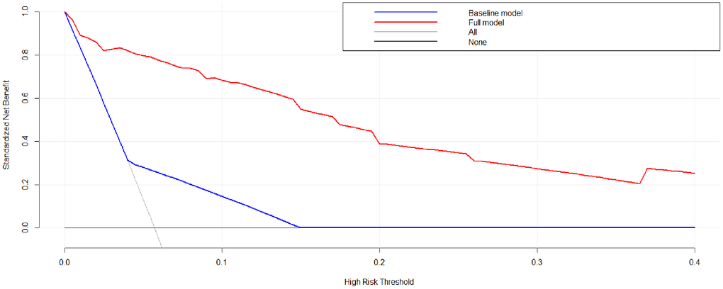 A nomogram model was developed based on the results of the multivariate logistic regression analysis to predict the occurrence of AL in patients with EC, as depicted in Figure 5. The C-Index of this predicting nomogram was calculated to be 0.940 (95% CI = 0.901–0.978), indicating a good discriminative ability of the model (Figure 6). Additionally, the decision curve analysis (DCA) demonstrated the clinical utility of this diagnostic nomogram model for making informed clinical decisions (Figure 7).