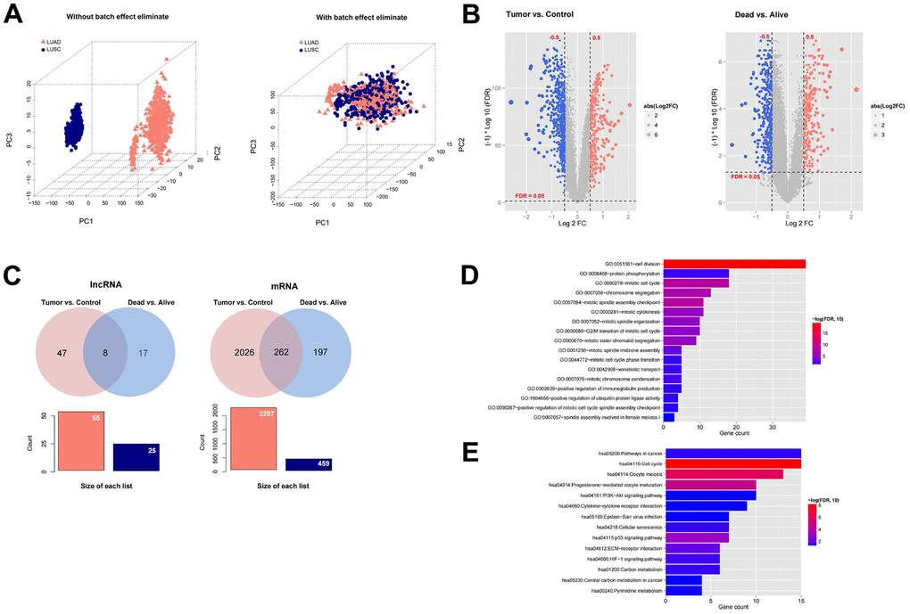 We downloaded the expression profile data corresponding to LUAD and LUSC in TCGA, and then combined them into a data set. The sample relationship before and after batch effect removal was shown in Figure 1A. In the expression profile data set after combining LUAD and LUSC, we first divided the samples into Tumor (n = 994) vs Control (n = 107) comparison group, and then divided the samples into Dead (n = 394) vs Alive (n = 600) comparison group. In the comparison group of Tumor vs. Control, 55 significantly differentially expressed lncRNAs and 2287 significantly differentially expressed mRNAs were screened (Figure 1B). In the Dead vs. Alive comparison group, 22 significantly differentially expressed lncRNAs and 459 significantly differentially expressed mRNAs were screened (Figure 1B). We further compared the DERs filtered in Tumor vs. Control and Dead vs. Alive, and a total of eight overlapping lncRNAs and 262 mRNAs were filtered (Figure 1C). The information list was shown in Supplementary Table 1. Finally, the enrichment analysis of GO function and KEGG signal pathway based on DAVID was carried out for the overlapped mRNAs with significant differential expression. A total of 17 significantly correlated GO signal pathways and 14 KEGG signal pathways were screened, which were displayed in Figure 1D–1F.