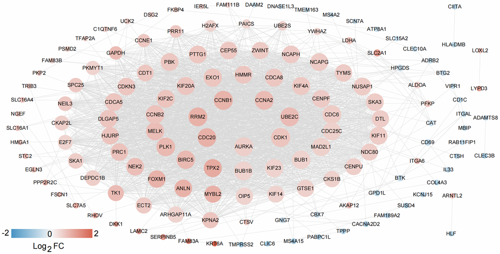 Based on the clinical survival and prognosis information of the samples, eight lncRNAs and 262 mRNAs by single factor Cox regression analysis were screened. Eight lncRNAs and 193 mRNAs that were significantly related to survival and prognosis were obtained. The eight lncRNAs were: FEZF1-AS1, SNHG12, BANCR, SNHG3, HLA-DQB1-AS1, SH3BP5-AS1, VIM-AS1, and FAM83A-AS1. Further multifactor Cox regression analysis was performed on 193 prognostication-related mRNAs, and the independent prognostication-related mRNAs were selected. A total of 30 independent prognostication-related mRNAs were obtained, which was shown in Supplementary Table 2. The STRING database was used to search for the interaction relationship between 262 mRNAs product proteins that are significantly related to survival and prognosis. The PPI network was constructed, as shown in Figure 2. The network contained 145 gene nodes in total.