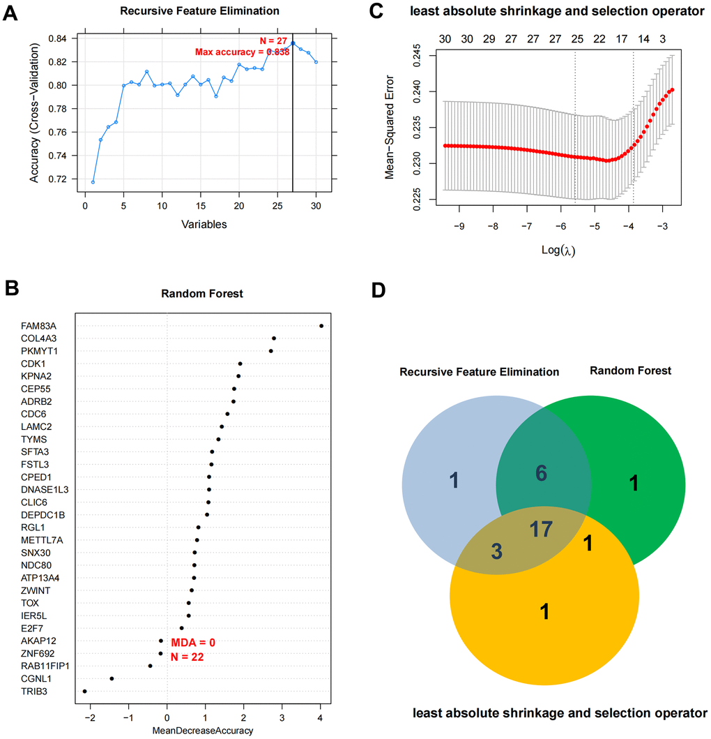 Based on the expression level of mRNAs that were significantly related to the independent prognosis obtained from the previous screening, three different optimization algorithms [LASSO (least absolute shrinkage and selection operator) [23], RFE (recursive feature elimination) [24], and RF (random forest) [25]] were used to screen the characteristic factors. We subsequently compared the results of the three algorithms and selected the overlapping part as the final feature mRNAs combination.