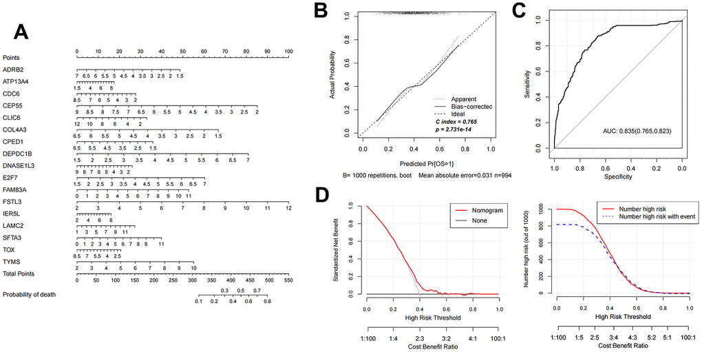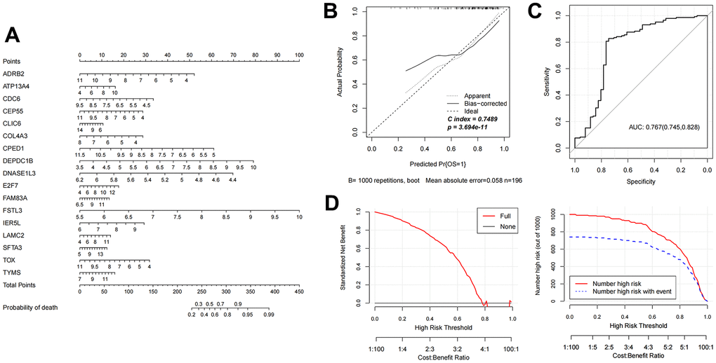 Based on the 17 characteristic mRNAs obtained by screening, we constructed a Nomogram prediction model according to the expression level of each factor, as shown in Figure 4A. Then, the Nomogram diagnostic model was analyzed by line graph, as shown in Figure 4B, from which the Cindex value was 0.765. After that, the decision curve analysis was carried out on the model to observe the net return rate of the sample diagnosis results of the model, as shown in Figure 4D. In addition, the ROC curve of the model was analyzed, and the results are shown in Figure 4C. Finally, in the validation data set GSE37745, the Nomogram model was also built based on the 17 mRNAs factors screened previously to verify the effectiveness of the diagnostic model. The results were shown in Figure 5A–5D). The ROC values of training set and testing set were 0.835 and 0.767, respectively.