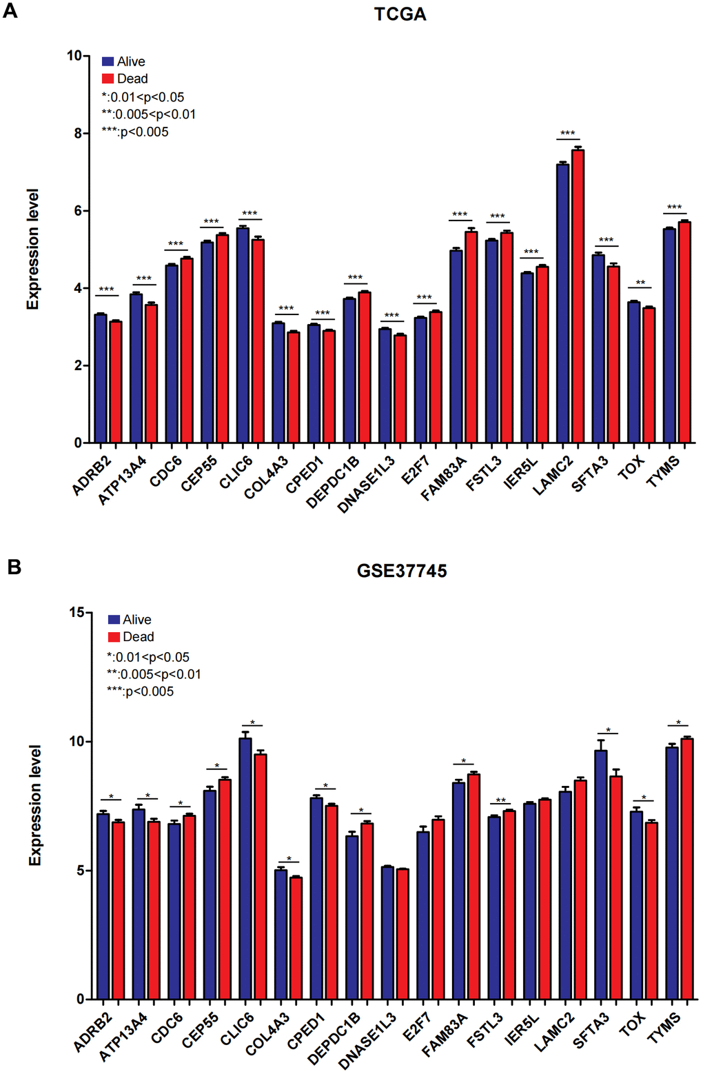 We visualized the expression level of 17 genes in the combined TCGA training data set and validation data set (GSE37745). As displayed in Figure 6A, 6B), the expression level of 17 genes in the GSE37745 validation data set was completely consistent with the direction of the expression difference in the combined TCGA training data set. The expression level of 13 genes, including ADRB2, ATP13A4, CDC6, CEP55, CLIC6, COL4A3, CPED1, DEPDC1B, FAM83A, FSTL3, SFTA3, TOX, TYMS, was significantly different in the group comparison.