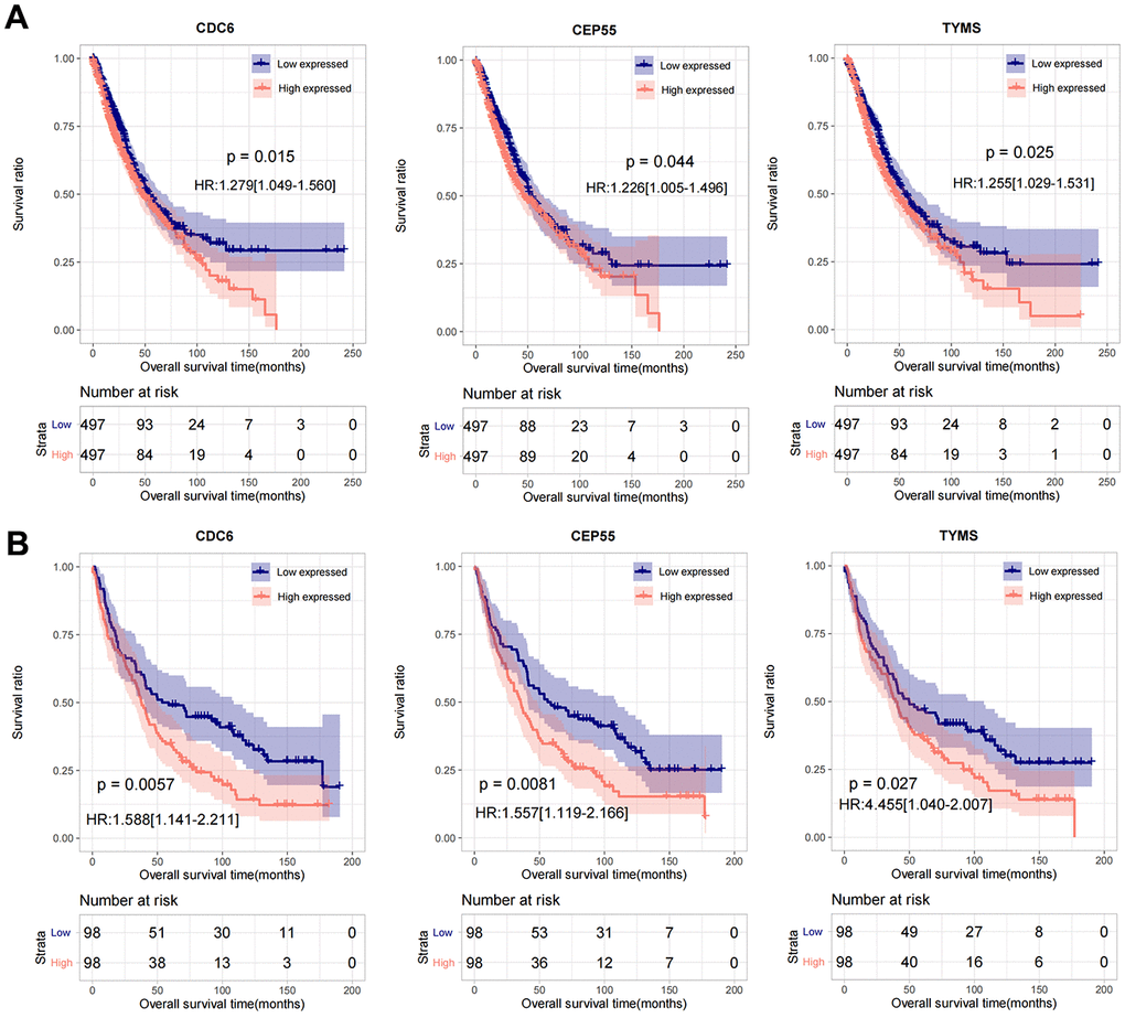 By comparing the 17 characteristic genes selected to construct the survival diagnosis model with the important link hub genes in the PPI network, the overlapping part was selected as an important factor, and a total of 3 genes were obtained: CDC6, CEP55, TYMS. In the combined TCGA training set and GSE37745 validation data set, the samples were divided into low-volume (expression level lower than the median value) and high-volume expression group (expression level higher than or equal to the median value) according to the respective expression level of the three genes. The Kaplan-Meier curve method was used to analyze and display the correlation between the expression level of important genes and survival and prognosis. The results are shown in Figure 7A, 7B), high expression of CDC6, CEP55, and TYMS predicted poor prognosis.