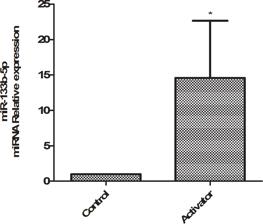 A tail vein was injected with miR-133b-5p activator (miR-133b-5p agomir, 10nmol, in situ injection of lung tissue two days before death), qPCR was used to detect the expression of miR-133b-5p in rat lung tissue, and the results showed that the expression of miR-133b-5p in rat lung tissue in the miR-133b-5p activator group was significantly higher than that in the blank control group, as shown in Figure 1.
