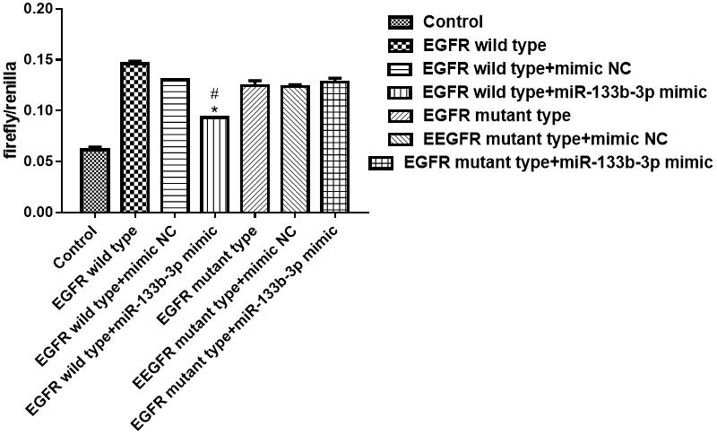 By constructing the dual-luciferase reporter vector, blank reagent group, the target gene EGFR wild-type dual-luciferase reporter vector group, the target gene EGFR wild-type dual-luciferase reporter vector + mimic NC group, the target gene EGFR wild-type dual-luciferase reporter vector + miRNA mimic group, the target gene EGFR mutant dual-luciferase reporter vector group, the target gene EGFR mutant dual-luciferase reporter vector + mimic NC group, the target gene EGFR mutant dual-luciferase reporter vector +miRNA mimic group was grouped with transfection of 293T cells, and the fluorescence spectrophotometer detected the fluorescence value, and the results showed that miR-133b-5p targeted binding to the target gene EGFR, the results were shown in Figure 2.