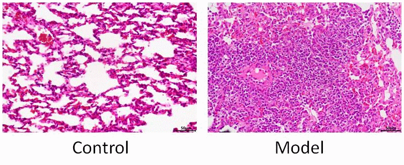Compared with the control group, the alveolar structure of the model group was destroyed, focal inflammatory cells appeared in the lung stroma and lung parenchyma, a large amount of mucus was visible in the lung interstitium, and the rat PM2.5 exposure model was successful, as shown in Figure 3.
