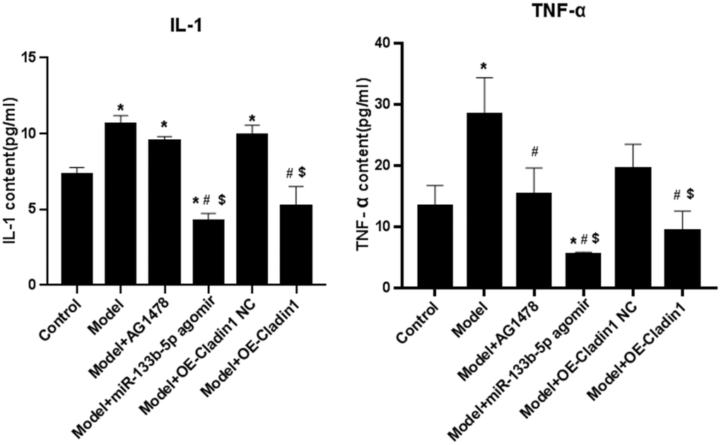 The content of IL-1 and TNF-α in the serum of rats in each group was detected by ELISA, and the results showed that the expression of IL-1 and TNF-α in the model group was significantly higher than that of the control, and the expression of IL-1 and TNF- in the model group was significantly higher than that in the model group, and in the model + AG1478 treatment group compared with the model group, and in the model + miR-133b-5p agomir treatment group compared with the control group, the model group and the model + Claudin1 overexpression no-load group, and in the model + The Claudin1 overexpression group is down-tuned compared to the model group and the model + Claudin1 overexpression no-load group, as shown in Figure 4.