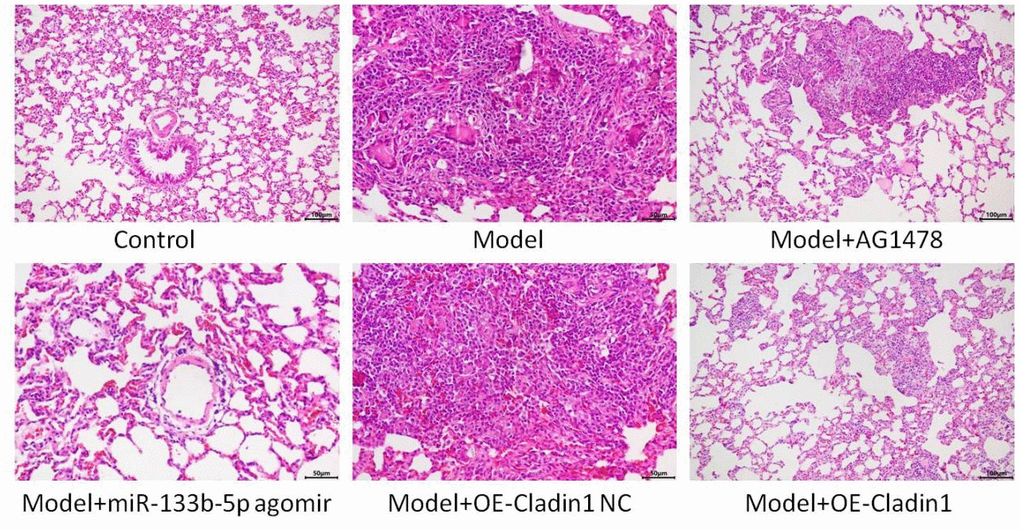 HE staining observation model group and model + Claudin1 overexpression blank load group of lung tissue has obvious interstitial edema, capillary wall expansion, accompanied by a large number of monocytes, lymphocytes and neutrophils large infiltration, alveolar cavity visible significant bleeding; In the lung tissues of the model + AG1478 treatment group, the model + miR-133b-5p agomir treatment group, and the model + Claudin1 overexpression group, the capillary dilation and congestion decreased, the degree of stromal edema decreased, and the infiltration of lymphocytes, monocytes, and neutrophils decreased, as shown in Figure 5.