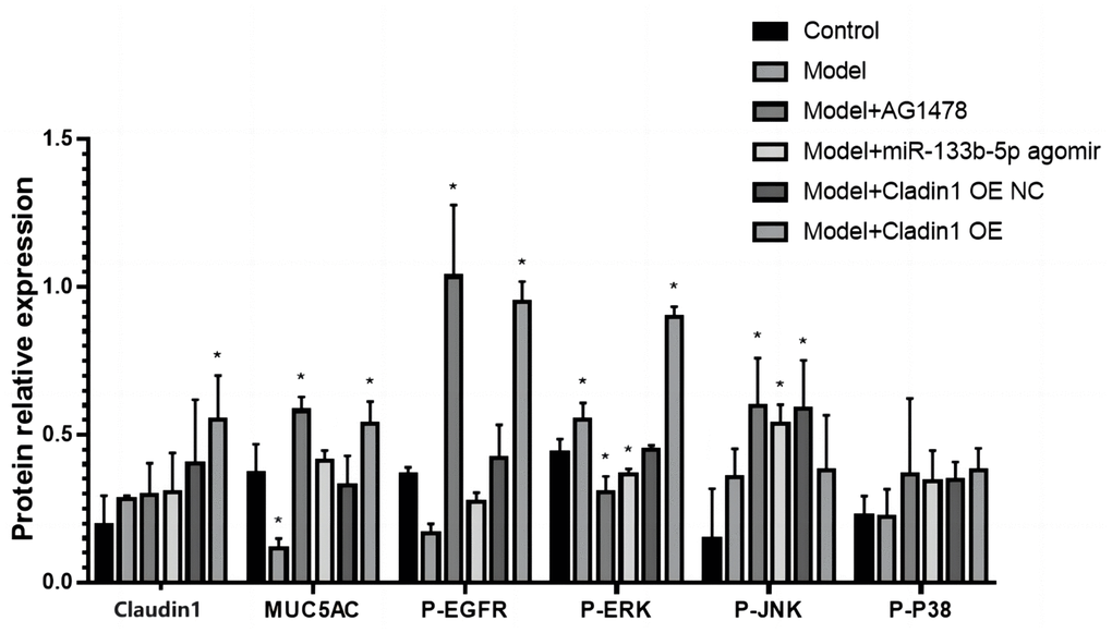The expression of p-EGFR, MUC5AC, p-ERK1/2, p-JNK, p-P38, Claudin1 protein was detected by WB, and the results showed that Claudin1 had the highest expression in the model + Claudin1 overexpression group, the MUC5AC and p-EGFR proteins were down-regulated in the model group, and the expression was upregulated in the model +AG1478 treatment group and the model + Claudin1 overexpression group, p-ERK1/2, The expression of p-JNK was upregulated in the model group, and there was no significant difference in the expression of the p-P38 protein in each group (Figure 6).