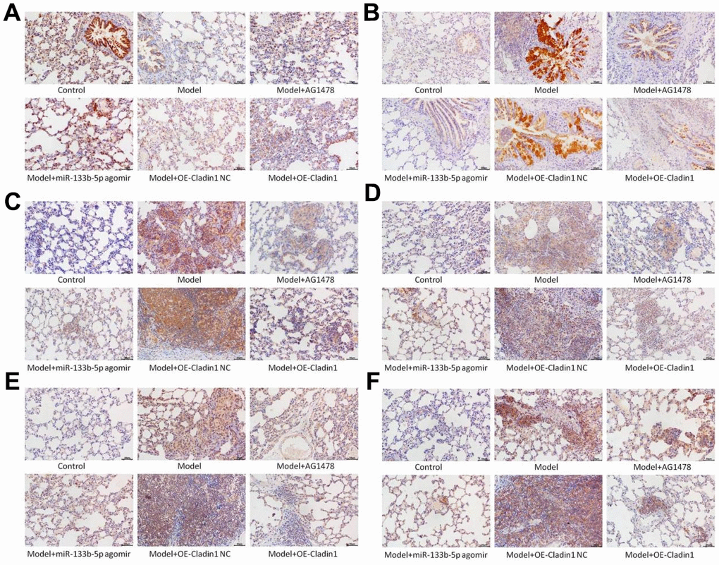 The expression of p-EGFR, MUC5AC, p-ERK1/2, p-JNK, p-p38 and Claudin1 proteins in lung tissues was detected by immunohistochemistry, and the results showed that the expression of p-EGFR, MUC5AC, p-ERK1/2, p-JNK, p-p-p38 protein was increased and Claudin1 protein expression decreased in the model group compared with the control group. There was no significant difference in the expression of the six proteins in the model group and the model + Claudin1 overexpression blank load group. In the model + AG1478 treatment group, the model + miR-133b-5p agomir treatment group and the model + Claudin1 overexpression group, compared with the model group, p-EGFR, MUC5AC, p-ERK1/2, p-JNK, p-p38 protein expression down-regulated, Claudin1 protein expression upregulated, the results are shown in Figure 7.