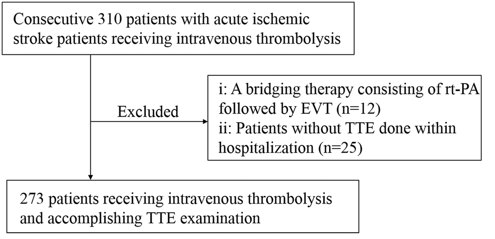 From June 2021 to May 2023, we prospectively collected a total of 310 patients treated with intravenous rt-PA (dose of 0.9 mg/kg, maximum 90mg) within 4.5 h of AIS onset in the National Stroke Prevention and Treatment Engineering Management Special Database. Of these, twelve patients who underwent intravenous thrombolysis combined with ET, and twenty-five patients with lack of LVEF data were excluded. Ultimately, 273 patients were eligible for inclusion in the final analysis (Figure 1).