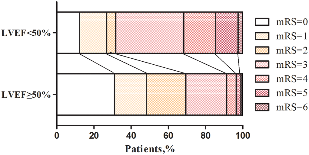 Fewer LVSD patients achieved a good functional outcome at 90 days (mRS≤2), however, there was no significant difference in the proportion of patients with sICH or HT compared with the non-LVSD group. By analyzing the distribution of mRS between the two groups, the relationship between LVEF levels and prognosis emerged. LVSD patients had significantly worse mRS scores after IVT in comparison with LVEF ≥ 50% patients (Figure 2). After adjusting for age, gender, and other conventional confounders, multivariate logistic regression analysis showed that higher NIHSS score (OR 1.08, 95% CI 1.04 to 1.11; p<0.001), pre-existing diabetes (OR 2.08, 95% CI 1.11 to 3.90; p=0.023), and presence of LVSD (OR 2.78, 95% CI 1.23 to 6.26; p=0.014) were associated with the 90-day poor functional outcomes (Table 2).
