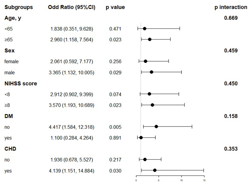 In the further multivariable logistic regression model with RCS analysis of AIS patients based on LVEF stratified, the proportion of patients achieving good functional outcomes at 90 days significantly decreased with greater degree of LVSD (P for nonlinearity = 0.414; Figure 3). The optimal cutoff values of the LVEF after rt-PA treatment for predicting 90-days poorer functional outcomes were 0.48 (Figure 3). The results of subgroup analyses classified by age (< 65 or ≥ 65 years), sex (female or male), NIHSS on arrival (< 8 or ≥ 8 scores), diabetes mellitus and coronary heart disease are depicted in Figure 4. Obviously, reduced LVEF levels after IVT were discovered to be related with poor outcomes, especially in elderly individuals and higher NIHSS scores (both p=0.023), male (p=0.029), and coronary heart disease (p=0.030).