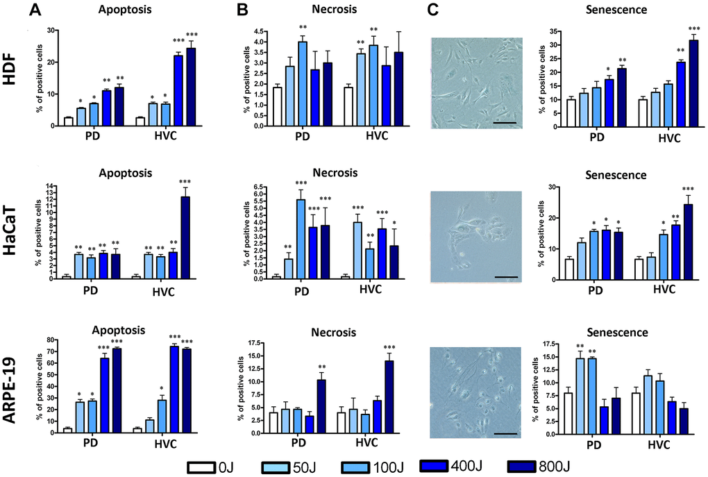 In Figure 2, we present schematic representations of the data obtained from HDF, HaCaT, and ARPE-19 cells irradiated with increasing UV doses using the two selected types of lamps (PD and HVC). The histograms display the percentages of apoptotic cells (early apoptotic: annexin V+ PI- and late apoptotic: annexin V+ PI+), necrotic cells (annexin V− PI+), and senescent cells (identified through the assay of acidic Beta Galactosidase). The results clearly demonstrate that even brief exposure to UV-C radiation is sufficient to induce apoptotic, necrotic, and senescent states in all examined cell types (HDF, HaCaT, ARPE-19). However, each cell type exhibited a distinct biological response pattern to UV irradiation.