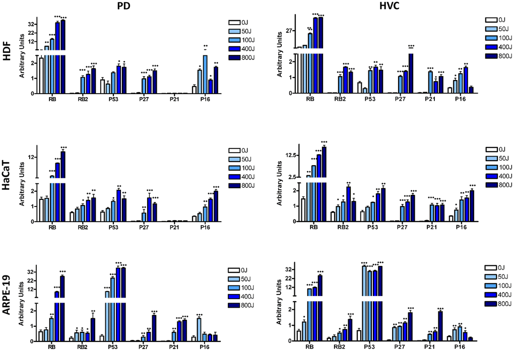 The upregulation of P21CDKN1A and P16INK4A, which play crucial roles in apoptosis and senescence, respectively, followed the overall biological trend observed in each cell line. Specifically, ARPE-19 cells, which were more prone to apoptosis, especially at high UV doses, demonstrated a progressive increase in P21CDKN1A. Additionally, P16INK4A expression was higher at 50J irradiation, coinciding with an observed increase in senescence (Figure 4).