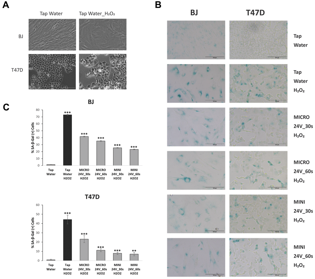 BJ cells were seeded at 1x105 cells per well on 6-well plates or at 1x104 cells per well on 24-well plates, and T47D cells were seeded at 0.5x105 cells per well on 6-well plates or at 0.5x104 cells per well on 24-well plates. After 24h incubation, DMEM was replaced with WEW (or tap water) and fibroblasts were induced to senescence with 25 μM H2O2 for 2h, medium was replaced with WEW (or tap water) without hydrogen peroxide and cells incubated for 48h; an induction for 2h was repeated and assays were performed after 48h. After replacing RPMI-1640 and treatment with freshly made WEW media (or tap water) for 3d, cancer cells were induced to senescence with 100 μM H2O2 and assays were performed after three days of induction.