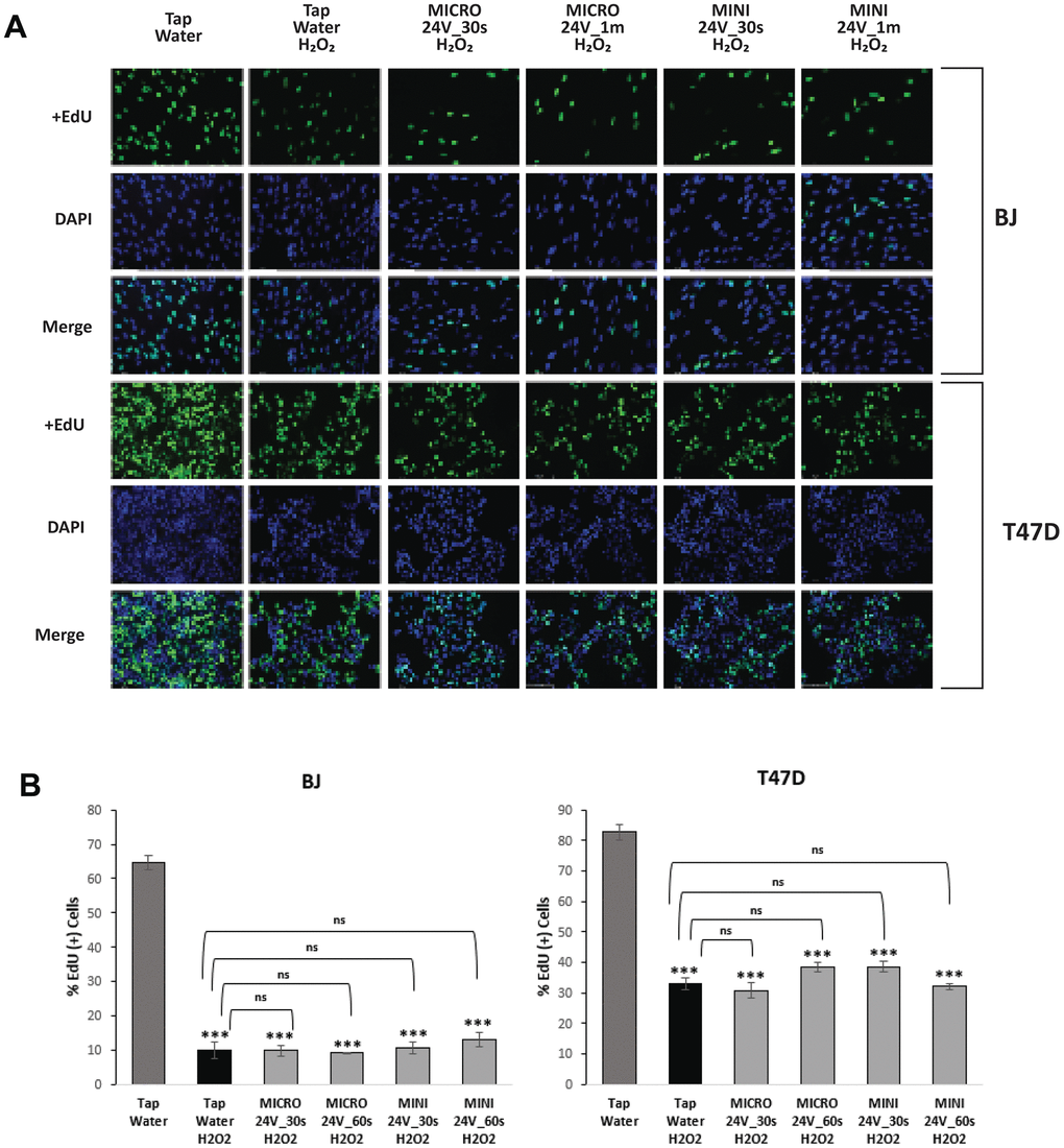 Fluorescence analysis of the incorporation of 5-ethynyl-2’-deoxyuridine (EdU) showed that a low percentage of normal BJ and tumorigenic T47D cells incorporated EdU after senescence induction, which is consistent with previous reports demonstrating that both cell types undergo growth arrest when induced to senesce [25]. Even though the two cell types did not display any difference in % EdU between Tap Water H2O2 versus Weo Electrolyzed Water H2O2, as described above, Ki67 expression was slightly elevated in WEW-treated normal cells compared to tumorigenic cells. However, this small difference was only detected using the MINI unit and not the MICRO unit. The MINI unit modifying the water more extensively than the MICRO unit, the potentially beneficial effects on the behavior of normal versus tumor cells (increasing ability of normal cells to divide) could be of interest for our overall approach.