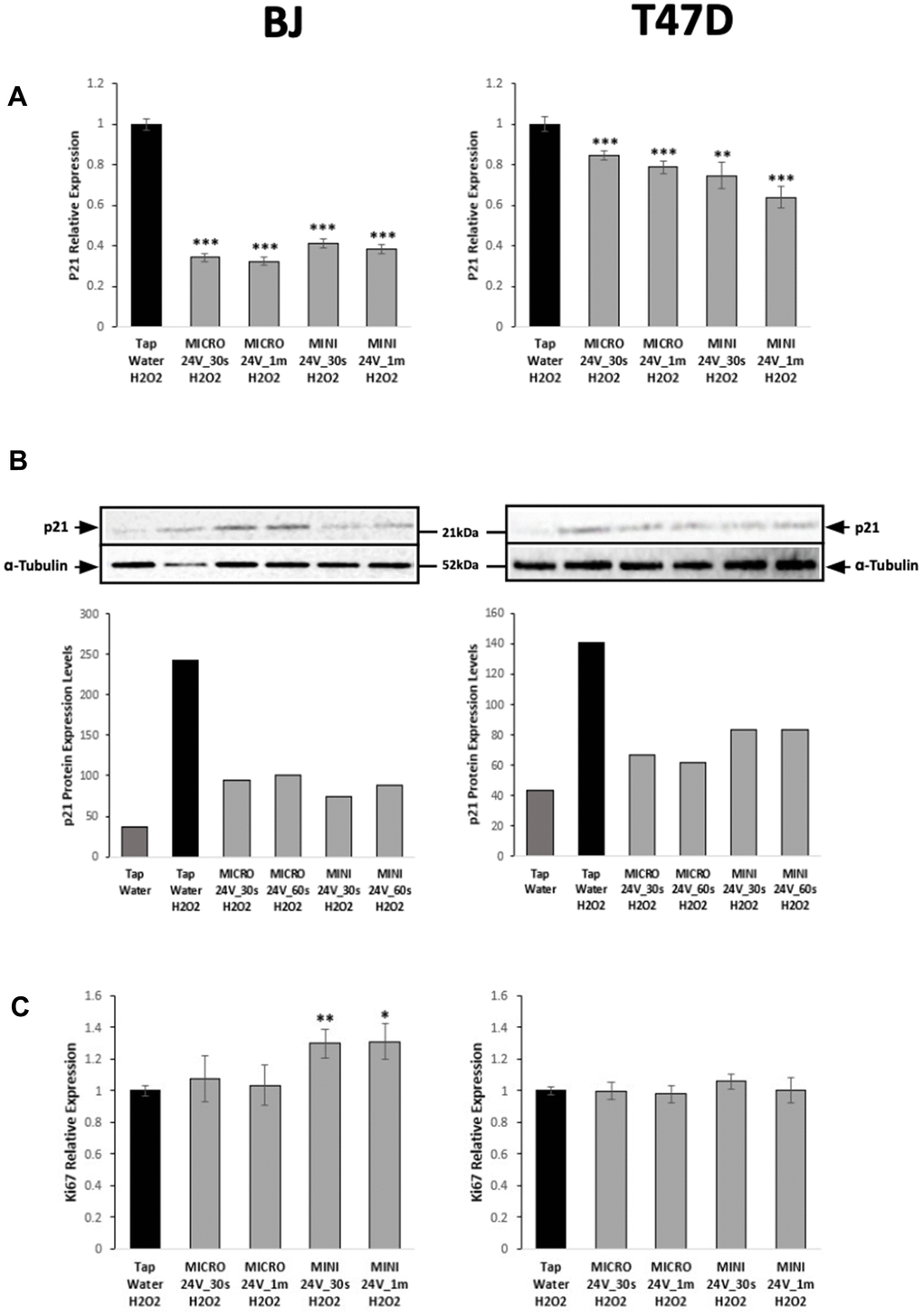 On the other hand, Ki67 was modulated differently in both cell types. Normal BJ cells treated with a higher charge of WEW showed a slight upregulation of the Ki67 gene, confirming the anti-senescent effects using WEW. Therefore, WEW may slightly stimulate the proliferative activity of normal human cells on top of reducing their senescent phenotype. However, we didn’t detect any significant difference in Ki67 expression in senescent T47D cells treated with WEW versus cells treated with tap water. Therefore, even though cellular senescence was reduced in breast cancer cells, the absence of WEW effects on their proliferative activity could be beneficial to prevent further tumor aggressiveness.
