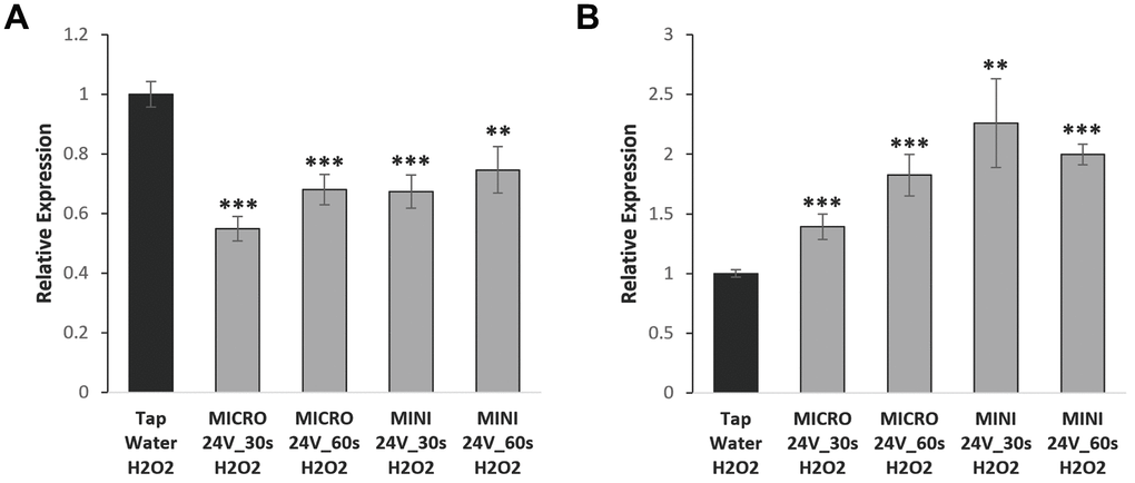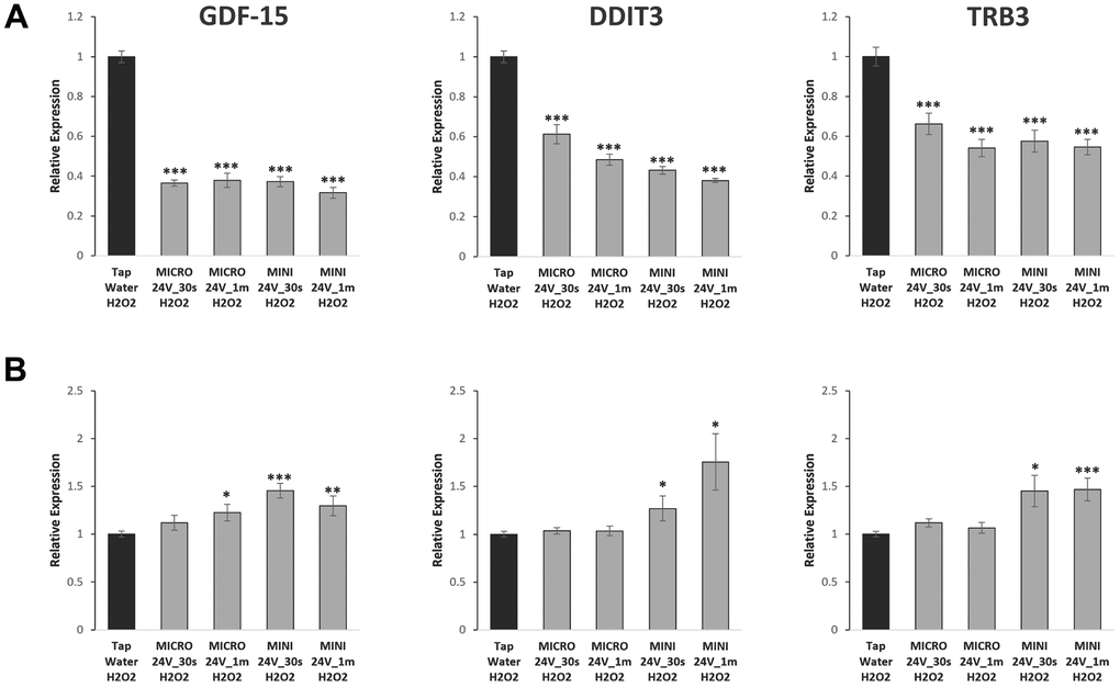 We previously obtained some RNA-Seq results to screen for genes potentially regulated by WEW, and we determined that several stress response genes, such as GDF-15, DDIT3 and TRIB3, were significantly modulated (data not shown). GDF-15 has recently been described as an aging marker, and the expression of DDIT3 and TRIB3 genes is similarly modulated during stress response [19–23]. The expression of these stress response genes in BJ fibroblasts was downregulated in cells induced to senescence/stress with H2O2 and then consequently treated with WEW, compared with tap water-treated cells (Figure 5). On the other hand, an upregulation of the same genes was observed in stress-induced breast cancer T47D cells treated with WEW. These results suggest that WEW triggers gene modulation in stressed cells, which is cell strain-specific.