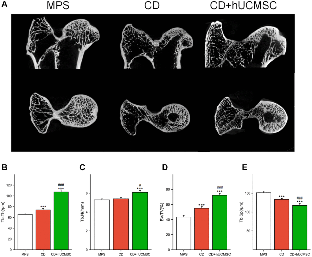 Micro-CT was employed for the quantitative analysis of the microstructure of the femoral head. In the MPS rabbit femoral head, the trabeculae were observed to be sparse and disorganized. However, in the CD+hUCMSCs group, the trabeculae appeared to be complete and well-aligned (Figure 1A). Furthermore, when comparing the CD+hUCMSCs group with the MPS group, significant differences were observed in several parameters. The CD+hUCMSCs group exhibited significantly higher values for Tb.Th, Tb.N and BV/TV. Additionally, the CD+hUCMSC group displayed a significantly lower value for Tb.Sp compared with the MPS group. The implantation of hUCMSCs inhibited the occurrence of osteonecrosis and promoted bone regeneration in the femoral head of the ONFH rabbit model, thus improving the aforementioned microstructure of the femoral head (Figure 1B–1E).