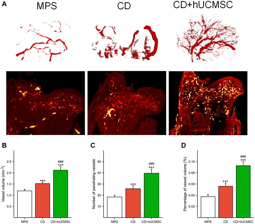 Micro-CT and angiography in each group were used to perform microvascular imaging of the femoral head (Figure 2A). The microvessel number, microvessel percentage, and microvessel volume were markedly improved in the CD+hUCMSC group in comparison to the MPS group (Figure 2B–2D). The implantation of hUCMSCs promoted microangiogenesis in the femoral head of the ONFH model rabbits.