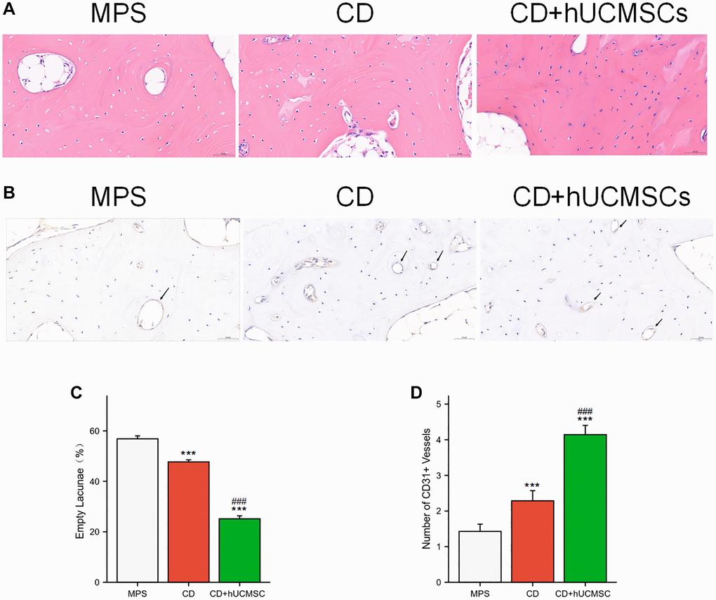 hUCMSCs reduced the incidence of empty lacunae and increased the number of CD31+ microvessels