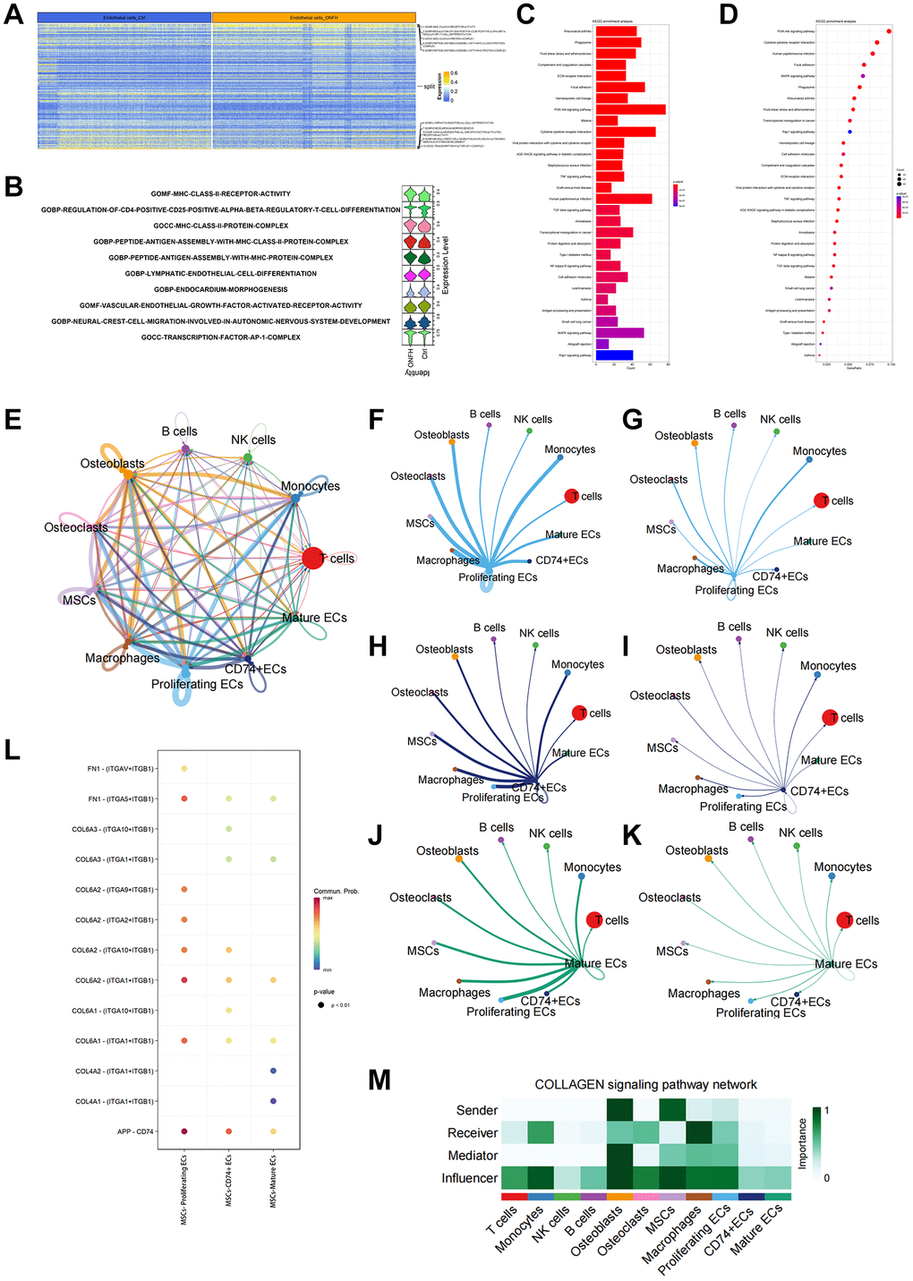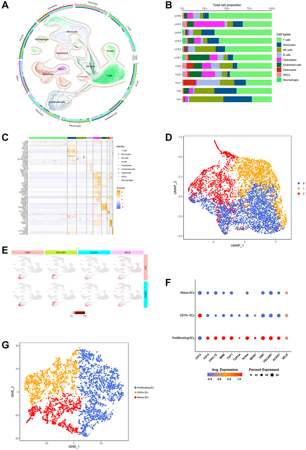We identified and categorized each cluster of cell types (Figure 4A), as follows: T cells, Monocytes, NK cells, B cells, Osteoblasts, endothelial cells (ECs), Osteoclasts, MSCs, and Macrophages. The proportion of each group of cells in the sample is shown in Figure 4B. The heat map shows the top 10 marker genes in each cluster (Figure 4C). Figure 4D shows ECs were clustered into 3 subtypes, while Figure 4E shows signature genes embedded on t-SNE dimension reduction map. Figure 4F presents a dot plot showing marker genes for ECs subtypes. The ECs were divided into three subtypes based on their proliferating capacity and the extent of their cell development. Three possible subtypes were identified: (0) proliferating ECs, (1) CD74+ ECs and (2) mature ECs (Figure 4G).