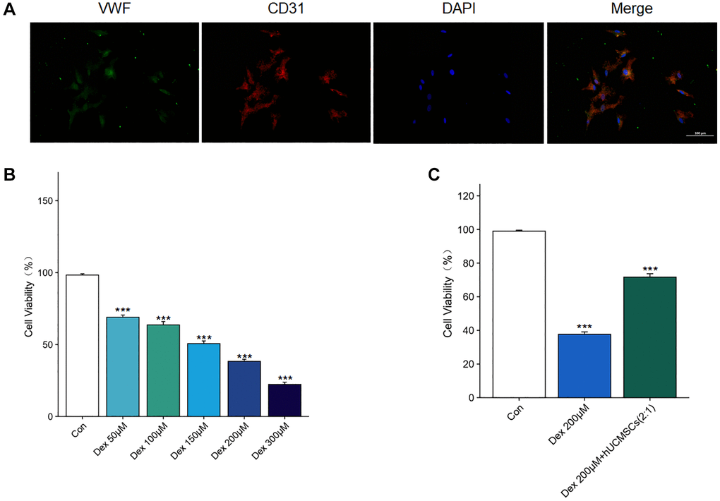 The Dex treatment of BMECs for 24 h was detected using CCK-8. We found that Dex inhibited BMECs’ viability in a concentration-dependent manner. Moreover, when the Dex concentration was 200 μM (Figure 6B), the cell viability of Dex-treated BMECs was significantly inhibited. However, the inhibitory effect of Dex was reversed after co-culture with hUCMSCs (Figure 6C). Therefore, 200 μM Dex will be used for subsequent experiments.