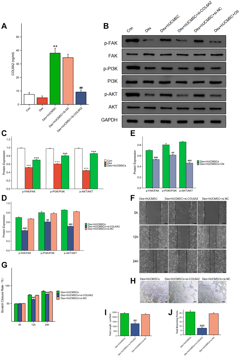 Collagen VI primarily exists in the extracellular matrix. In addition to its anchoring role, Collagen VI can also regulate apoptosis and oxidative stress and promote cell growth [36]. Moreover, Collagen VI consists of three primary isoforms encoded by three genes, COL6A1, COL6A2, and COL6A3, respectively. Collagen VI can bind to many cell surface receptors to perform biological functions, including integrin α1β1 [37]. Integrins are cell surface transmembrane receptors, and activated integrins can induce changes in intracellular signaling pathways, which primarily include the FAK/PI3K/AKT signaling pathway [38]. The FAK is a non-receptor tyrosine kinase that can be activated by VEGF and integrins [39], and it is involved in ECs proliferation, survival, and migration [40, 41]. Therefore, FAK plays a pivotal role in angiogenesis [42]. We found that the migration and angiogenic ability of BMECs received inhibition after Dex treatment, while p-FAK/FAK, p-PI3K/PI3K, and p-AKT/AKT expression were reduced. After co-culture with hUCMSCs, the inhibition of BMECs migration and angiogenic ability was reversed, while p-FAK/FAK, p-PI3K/PI3K, and p-AKT/AKT levels were up-regulated. The supernatant of the hUCMSCs culture medium had a markedly higher concentration of COL6A2 than that in the Con group, and the knockdown of COL6A2 in hUCMSCs reversed the levels of p-FAK/FAK, p-PI3K/PI3K, and p-AKT/AKT. It is suggested that hUCMSCs may apply their protective effects on BMECs by activating the FAK/PI3K/AKT signaling pathway through COL6A2. Concurrently, the up-regulation of p-FAK/FAK, p-PI3K/PI3K, and p-AKT/AKT levels were reversed after the use of the specific inhibitor of integrin α1β1, Ob, which suggests that FAK/PI3K/AKT signaling pathway activation by COL6A2 is mediated through integrin α1β1.