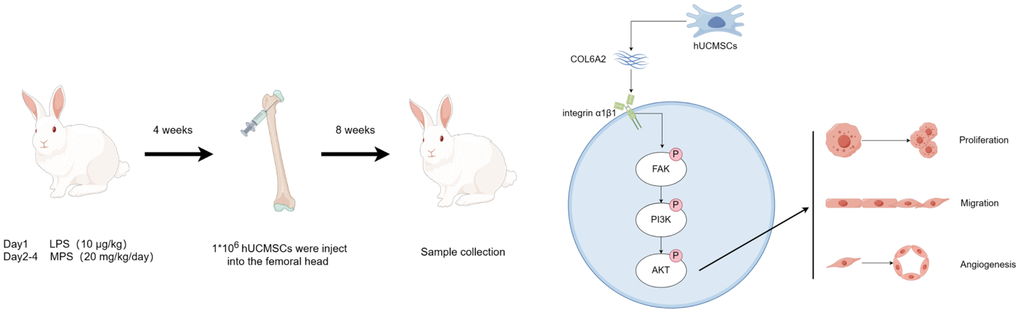 In conclusion, this study revealed that hUCMSCs can promote femoral head angiogenesis and bone repair in the Steroid-induced ONFH rabbit model. Moreover, the hUCMSCs can promote the migration and angiogenesis of Dex-treated BMECs in vitro, and the mechanism of action is that hUCMSCs secrete COL6A2 to activate FAK/PI3K/AKT signaling pathway through integrin α1β1.