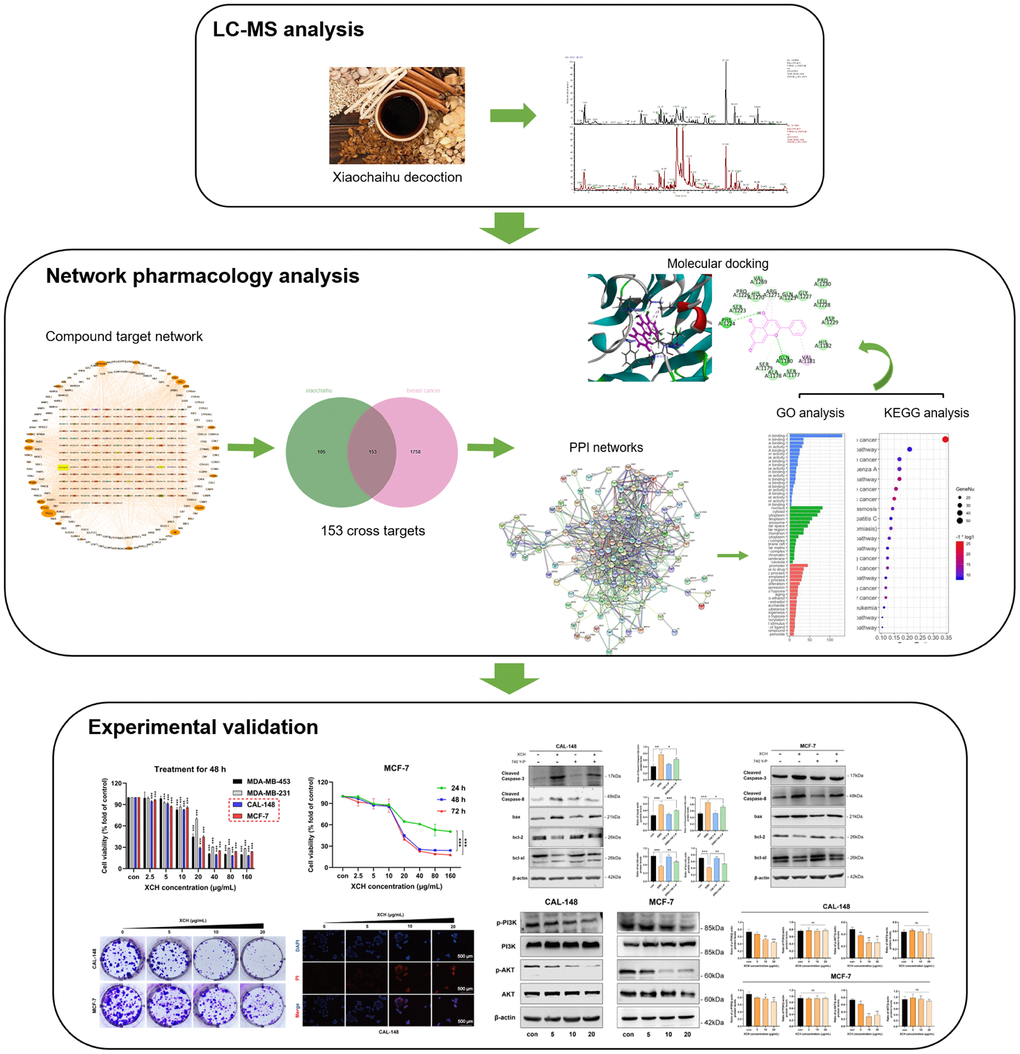 Due to the large number of components and complex action targets of traditional Chinese medicine, conventional pharmacological approaches cannot be studied comprehensively. Therefore, we need to find new research methods. Network pharmacology is an emerging discipline that combines pharmacology, computer science, and bioinformatics [10]. Through network pharmacology, we can combine numerous traditional Chinese medicine ingredients and disease targets for comprehensive analysis. In the present study, we applied network pharmacology to explore the potential molecular mechanism of the XCH decoction in breast cancer. In addition, in vitro experiments were also conducted to validate the potential underlying mechanism of the XCH decoction on breast cancer, as predicted by a network pharmacology approach. Figure 1 shows the study design of this work.