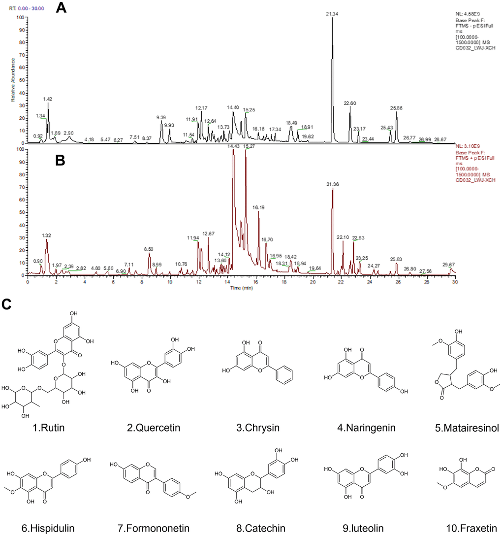Q Exactive Orbitrap LC-MS/MS was applied for qualitative analysis of the XCH decoction. The total ion chromatograms are shown in Figure 2A, 2B under negative-ion polarity mode and positive-ion polarity mode, respectively. Over 70 principal compounds were identified from the XCH decoction using LC-MS/MS analysis. Based on the database (Thermo Fisher Scientific, Waltham, MA, USA) with a matching score greater than 80 and combined with literature reports, we screened 10 compounds related to antitumor activity, as shown in Figure 2C.