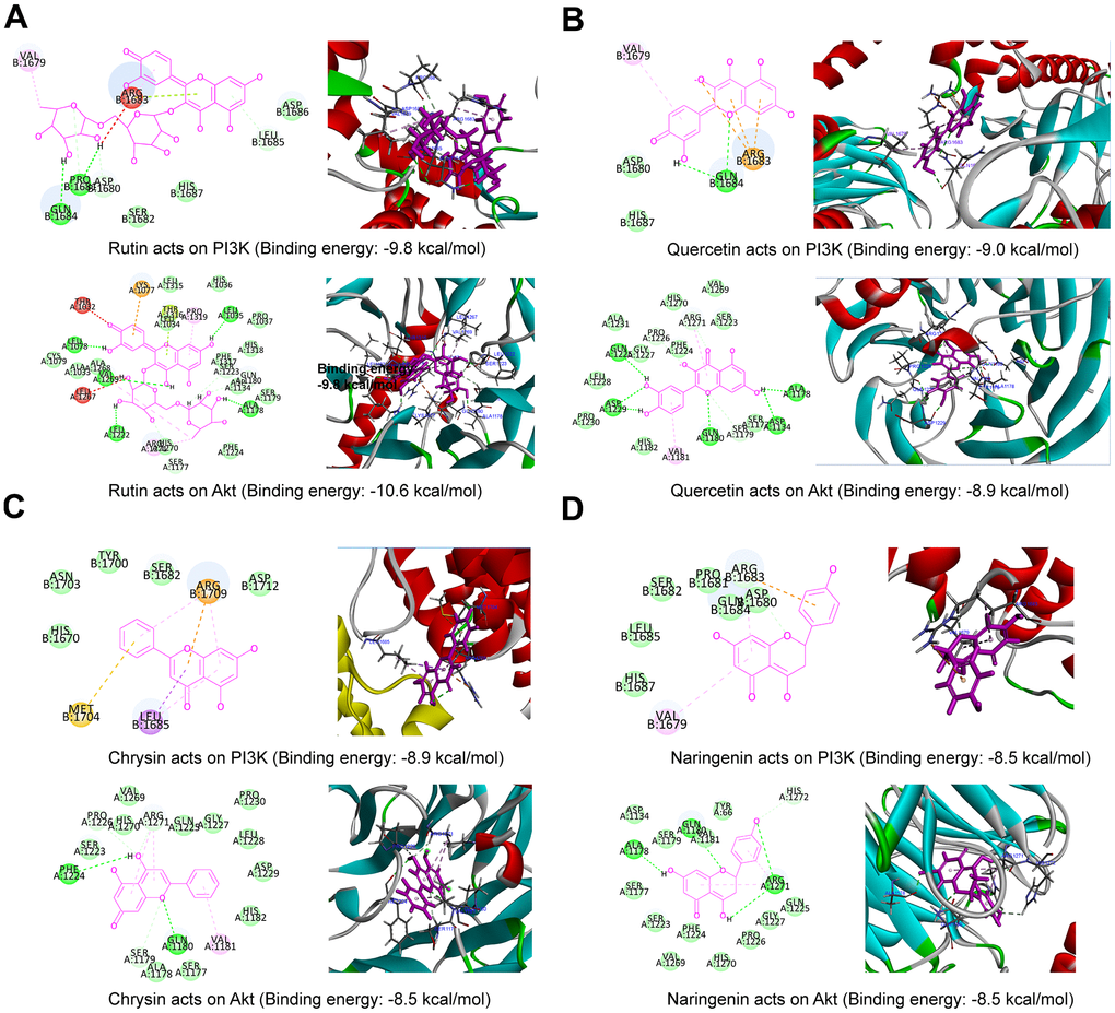 Based on the PPI network analysis of the XCH decoction on breast cancer and Q Exactive Orbitrap LC-MS/MS analysis, the core active ingredients were molecularly docked with the core targets PI3K and Akt to simulate the interaction between the ingredients and targets. The binding energy was calculated by AutoDockTools 1.5.6. The greater the binding force between the protein and the compound is, the lower the binding energy. When the docking binding energy is less than -5.0 kcal/mol, the compound has a strong binding ability with the protein. As shown in Figure 4, we selected the core active ingredients (rutin, quercetin, chrysin, and naringenin) and the core targets (PI3K and Akt) for molecular docking, and the docking binding energy was less than -5.0 kcal/mol; for example, PI3K binds to rutin with a binding energy of -9.8 kcal/mol, Akt binds to quercetin with a binding energy of -8.9 kcal/mol, and Akt binds to naringenin with a binding energy of -8.5 kcal/mol. All molecular docking energy results are shown in Supplementary Table 2.