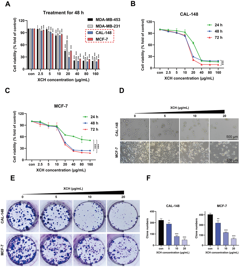 The effects of the XCH decoction on cell viability were determined by the CCK-8 assay. Human breast cancer cell lines were plated in 96-well plates (3×103/well). The next day, fresh DMEM supplemented with 0-160 μg/mL XCH decoction was added, and the cells were incubated for 24-72 h. Afterward, 10 μL of CCK-8 solution was added to each well, which was mixed with serum-free medium in an incubator at 37° C for 2 hours. Afterward, the absorbance was determined with a SynergyH1 microplate spectrophotometer (Bio Tek) at 450 nm. To assess cell morphology, CAL-148 and MCF-7 cells were examined under a light microscope at 40× magnification (Nikon, Japan).