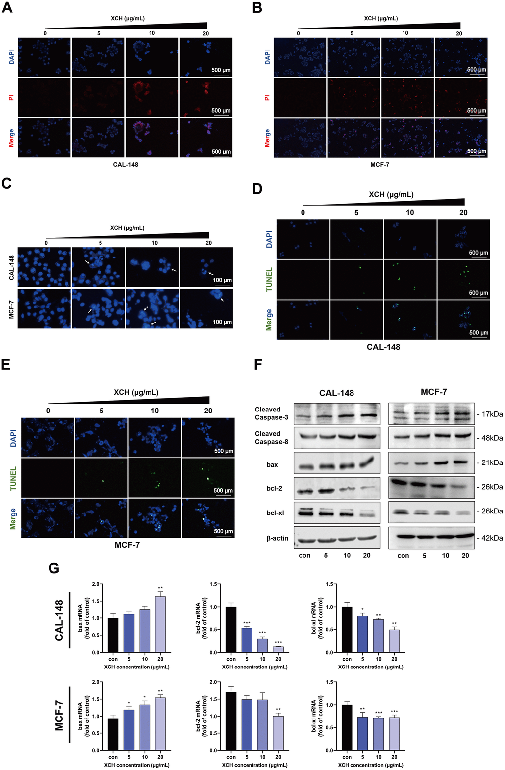 We evaluated the effect of the XCH decoction on cell death via a propidium iodide assay. As displayed in Figure 6A, 6B, the number of dead cells increased with increasing concentrations of the XCH decoction. Then, we used the Hoechst 33342 assay and the TUNEL assay to detect the apoptosis of breast cancer cells. With increasing concentrations of the XCH decoction, the cell brightness, degree of chromatin condensation and fragmentation increased (Figure 6C). The results of the TUNEL assay are consistent with those of the Hoechst 33342 assay. The number of cells stained with green fluorescence in the XCH decoction group was significantly greater than that in the control group (Figure 6D, 6E). Furthermore, we used flow cytometry to determine the effect of the XCH decoction on the apoptosis of CAL-148 and MCF-7 cells (Supplementary Figure 1). These results are consistent with those of the TUNEL and Hoechst 33342 assays. Subsequently, we detected the expression levels of apoptosis-related proteins in CAL-148 and MCF-7 cells by Western blotting. The results confirmed that the expression of cleaved caspase-3, cleaved caspase-8 and bax was upregulated, but the expression of bcl-2 and bcl-xl was downregulated by treatment with the XCH decoction (Figure 6F and Supplementary Figure 2). In addition, qRT-PCR was utilized to assess the expression levels of the bcl-2, bcl-xl, and bax genes. Figure 6G shows that the change in the mRNA level was concordant with the Western blot results.