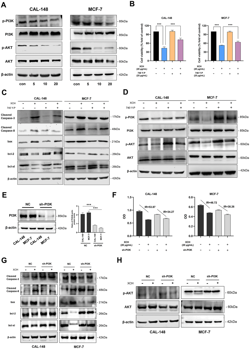Previous bioinformatics analysis suggested that the anti-breast cancer mechanism of the XCH decoction may involve regulating the PI3K/Akt pathway. To verify the results of the bioinformatics analysis, PI3K/Akt pathway-related proteins were further detected by Western blot. The levels of phosphorylated PI3K and phosphorylated Akt were markedly decreased after treatment with the XCH decoction (Figure 7A). To confirm the results of the experiment, we analyzed cell viability after treatment with the XCH decoction with or without a PI3K agonist (740Y-P). As shown in Figure 7B, the XCH decoction obviously inhibited cell viability. However, the PI3K agonist attenuated the XCH decoction-induced decrease in cell viability. Next, we measured the expression levels of proteins associated with apoptosis and the PI3K/Akt signaling pathway. Similar to the results of the CCK-8 assay, the PI3K agonist reversed the effects of the XCH decoction on breast cancer cells and the inhibition of the PI3K/Akt pathway (Figure 7C, 7D and Supplementary Figure 3). In addition, we constructed PI3K-knockdown CAL-148 and MCF-7 cells to verify the above experimental results (Figure 7E). The results showed that the inhibition of breast cancer cells by the XCH decoction was attenuated when PI3K was knocked down (Figure 7F). Moreover, compared with those in the NC group, the effects of XCH on the expression of apoptosis- and PI3K pathway-related proteins in the PI3K knockdown group were partially attenuated (Figure 7G, 7H and Supplementary Figure 4). Collectively, these results suggest that the anti-breast cancer mechanism of the XCH decoction might be associated with the regulation of the PI3K/Akt pathway.