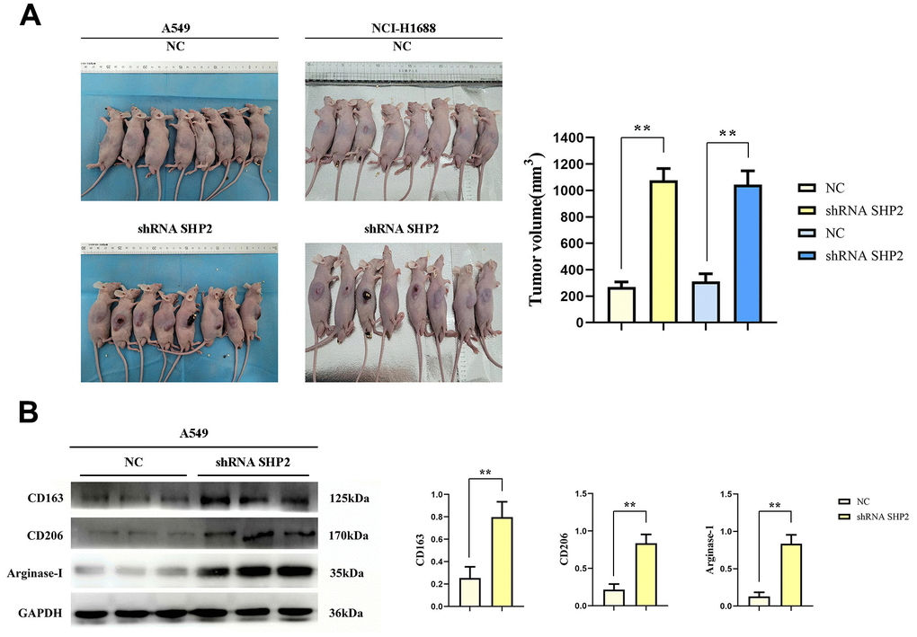 We examined SHP2’s role in tumor-associated macrophages (TAM) on lung adenocarcinoma by co-injecting A549 and NCI-H1688 cells with lentivirus-infected THP1 cells (comprising both control and SHP2-silenced groups) into nude mice. Tumor volume measurements revealed significantly larger tumors in the SHP2-silenced group, underscoring SHP2’s suppressive effect on lung adenocarcinoma growth (Figure 1A).