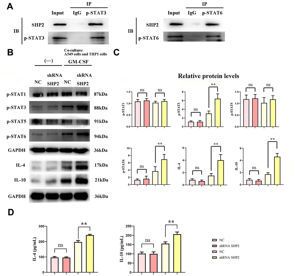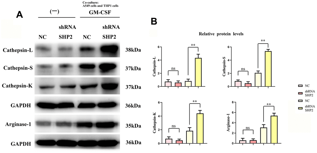 Experimental results, using techniques such as Western blotting and ELISA, revealed no significant changes in the expression of several markers (p-STAT1, p-STAT3, p-STAT5, p-STAT6, IL-4, IL-10, various cathepsins, and Arginase-1) in the sh-RNA SHP2 group versus control, except for a notable reduction in SHP2 expression. However, in THP-1 cells co-cultured with A549 lung adenocarcinoma cells, the expression of p-STAT3, p-STAT6, and other markers significantly increased, suggesting that GM-CSF from A549 cells can suppress SHP2 in TAMs, thus activating the STAT3/STAT6 pathway and enhancing cathepsin secretion and M2 macrophage polarization.