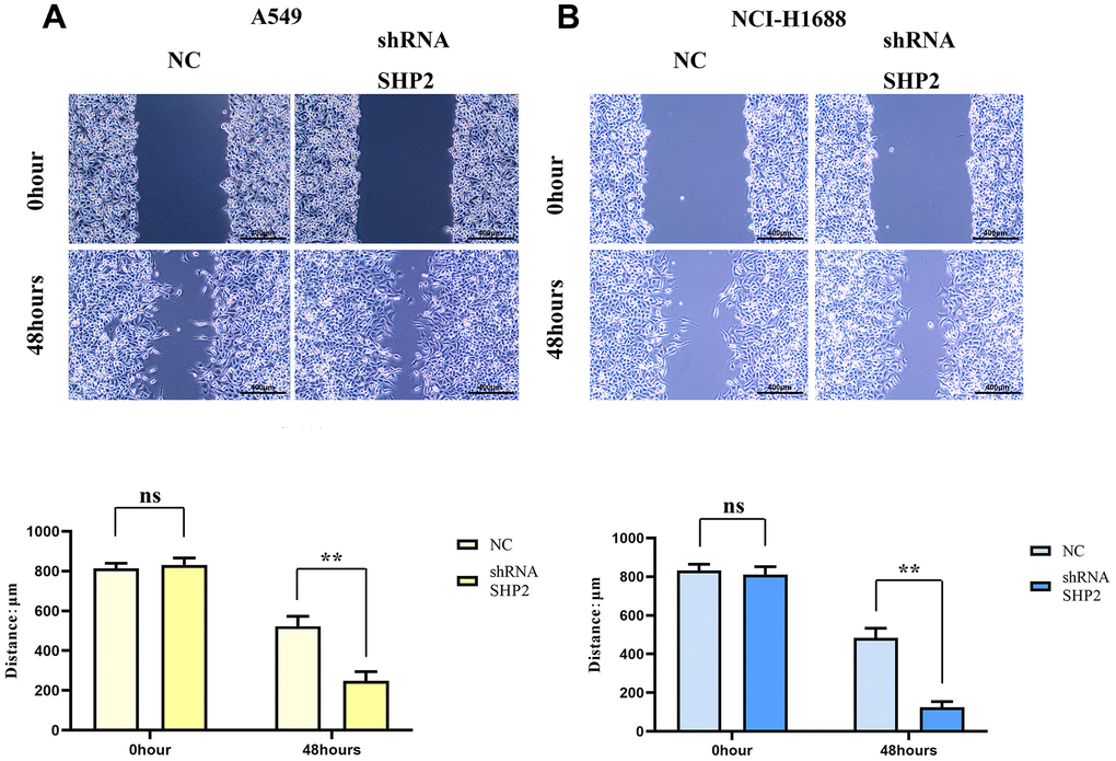 Then the cocultured A549 cells and NCI-H1688 cells are made into cell suspensions and inoculated on six-well plates. 24-hour incubation at 37° C in a 5% CO2 incubator is performed. After the cell density reaches 70%, a 100 μL sterile pipette is used to perform the healing experiment with the tip of the scratch as perpendicular to the cells as possible to ensure that the width of the scratch is essentially the same for each group. The cells are washed twice with PBS and then incubated for 24 hours at 37° C in 5% CO2 serum-free medium. Photographs are taken at 0h and 48h respectively to measure the healing distance.