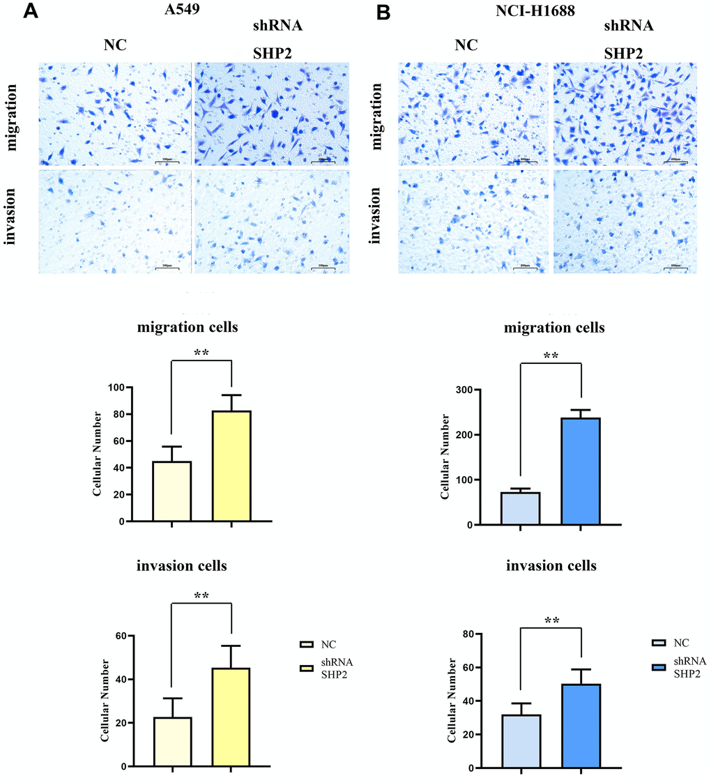 Migration experiment: A549 cells and NCI-H1688 cells are resuspended in serum-free medium. 100 μL of cell suspension is added to the upper chamber of Transwell, and 600 μL of serum-containing medium is added to the lower chamber for 48 hours. The cells on the top surface of the membrane that have not migrated are removed with cotton swabs, and the cells on the lower surface of the membrane are fixed with paraformaldehyde. After washing, they are stained with crystal violet. After washing and drying, the cells are counted under an inverted microscope. Invision experiment: Matrigel is diluted with serum-free medium at a ratio of 1:8, wrapped around the upper surface of the membrane at the bottom of the Transwell, and incubated in an incubator at 37° C for 4 hours to polymerize Matrigel into gels for later use. The rest of the procedure is the same as the Migration experiment.