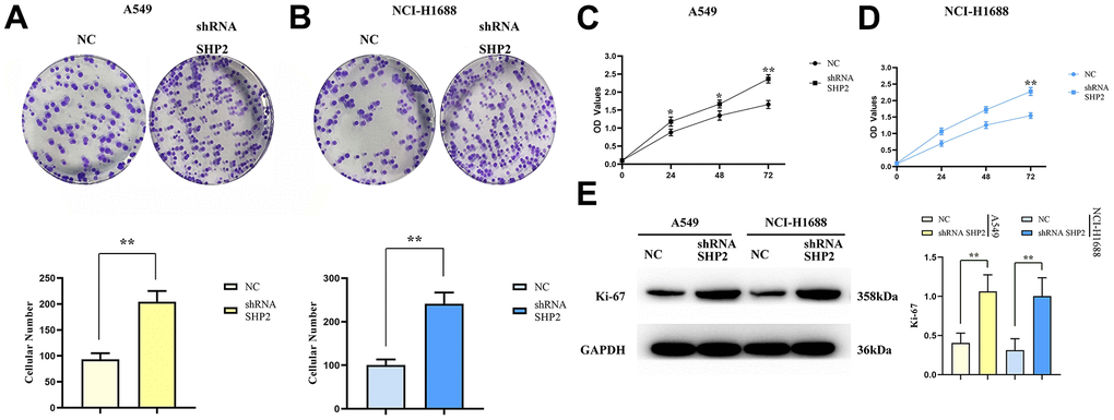 Further investigations using cell healing and Transwell assays demonstrated that SHP2 inhibition boosts the migratory and invasive capacities of lung adenocarcinoma cells. Monoclonal assays and CCK8 experiments showed that SHP2 suppression leads to a significant increase in the proliferation of A549 and NCI-H1688 cells, corroborated by a marked rise in Ki-67 expression.