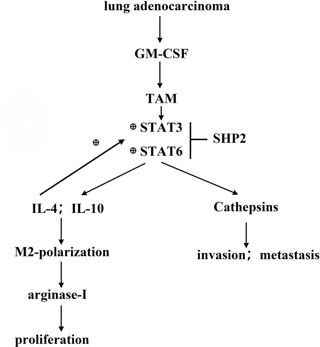 In summary, this study illuminates how GM-CSF from lung adenocarcinoma cells modulates the SHP2 function and activates key signaling pathways, contributing to tumor progression by promoting cell proliferation, migration, and macrophage polarization towards an M2 phenotype. These insights could pave the way for novel therapeutic strategies for lung adenocarcinoma treatment.