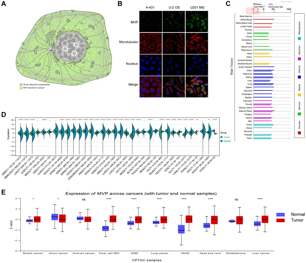 MVP is primarily localized to the cytoplasm in human cells, as depicted in Figure 1A. To further characterize MVP’s intracellular localization, immunofluorescence assays to assess its distribution within the nuclei and microtubules of A-431, U-2 OS, and U251 MG cells. Our observations revealed that MVP colocalizes with cytoplasmic markers in cancer cells, providing strong evidence for subcellular localization of MVP in the cytoplasm (Figure 1B). Additionally, we investigated the expression of MVP messenger RNA (mRNA) across various normal human tissues, including immune, internal, neurological, secretory, muscular, and reproductive tissues (Figure 1C). Our findings underscored the widespread expression of MVP mRNA in these diverse tissue types, indicating its potential involvement in various cellular processes beyond cancer.
