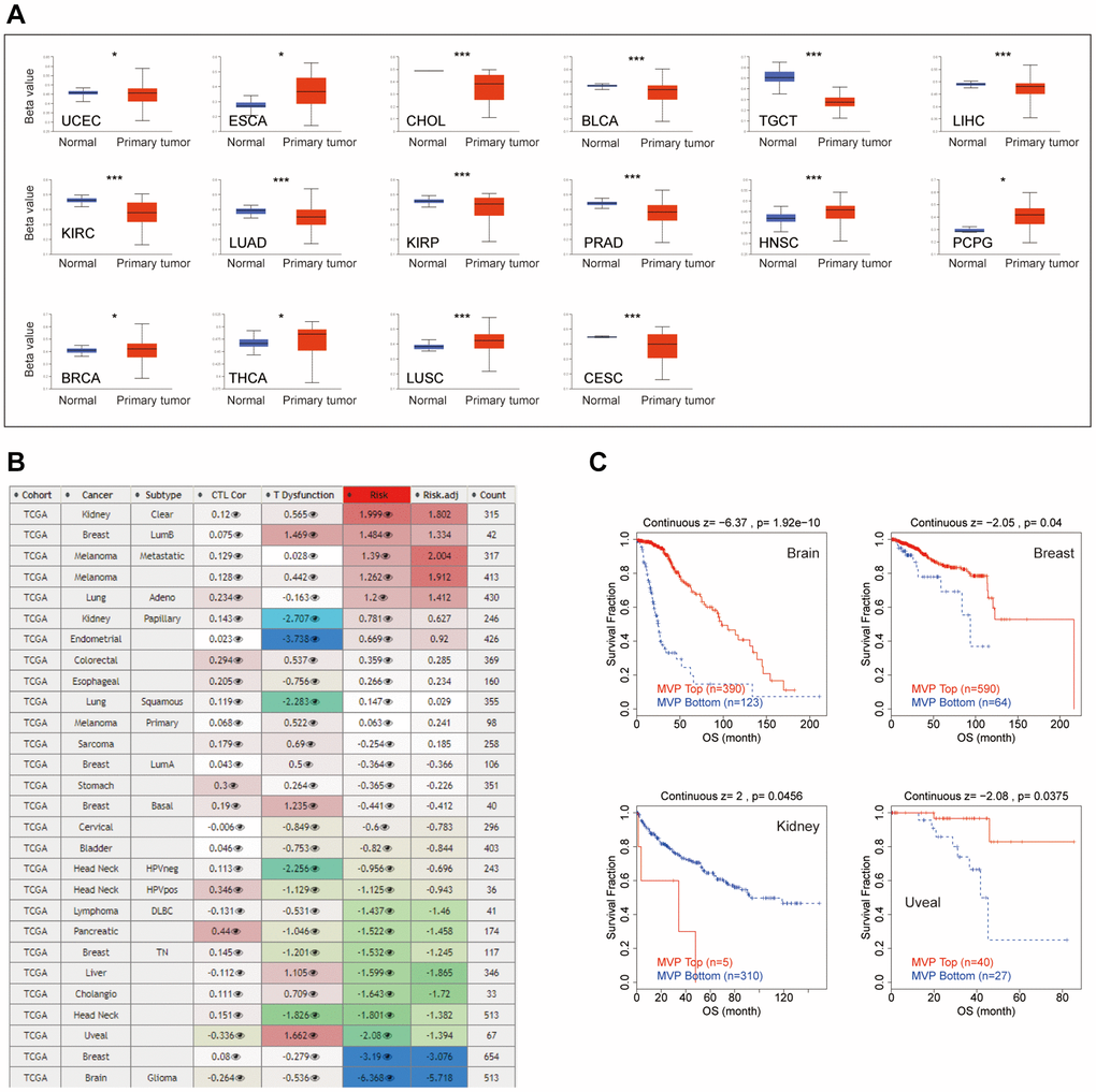The promoter methylation state analysis revealed hypermethylation of MVP in several cancer types, namely esophageal cancer (ESCA), HNSC, pheochromocytoma and paraganglioma (PCPG), BRCA, thyroid cancer (THCA) and LUSC. Conversely, MVP exhibited hypomethylation in bile duct cancer (CHOL), endometrioid cancer (UCEC), testicular cancer (TGCT), KIRC, lung adenocarcinoma (LUAD), PRAD, Cervical Cancer (CESC), and bladder cancer (BLCA) cancer types, as illustrated in Figure 3A. Furthermore, we examined the impact of MVP methylation status on cytotoxic T cell (CTL) activity, dysfunctional T cell phenotype, and various cancer risk factors, as depicted in Figure 3B. Our analysis demonstrated a positive correlation between hypomethylation of MVP and dysfunctional T cell phenotype, leading to reduced OS in brain, breast cancer, and uveal cohorts. Conversely, hypomethylation of MVP was associated with a favorable prognosis in kidney, as shown in Figure 3C. These results suggest that the epigenetic methylation levels of MVP in cancer patients are linked to dysfunctional T cell phenotypes, resulting in unfavorable outcomes for the brain, breast cancer, and uveal cohort, while improving survival in the kidney cohort.