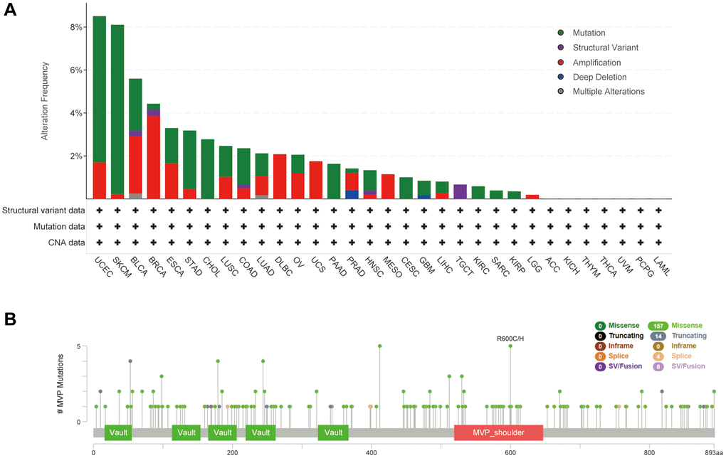 Using the cBioPortal online database, we conducted an analysis of genetic alterations in MVP across various cancer types, as depicted in Figure 4A. The most prevalent genetic alteration in MVP was the “mutated” type, observed in nearly all TCGA cancer cases. Following this, the “amplified” type was identified, while multiple alterations were infrequent. Notably, the highest frequency of MVP alterations (>8%) was observed in UCEC and SKCM patients, primarily in the form of “mutation”. In BRAC samples, the prevailing alteration type was “amplification”. Furthermore, we investigated specific information regarding genetic alterations in MVP across different tumors. Our findings revealed that missense mutations were the predominant alteration type (Figure 4B), where R600C/H alterations were predominantly observed.